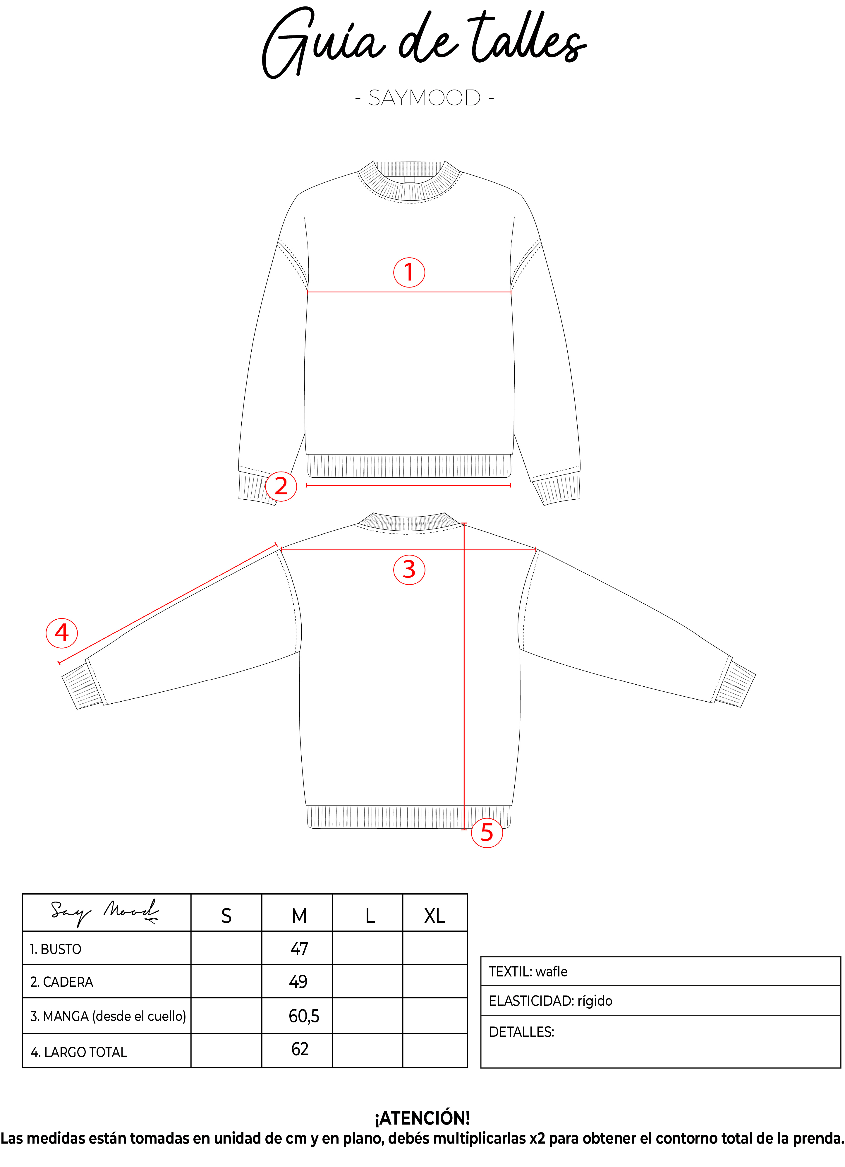 SAYTIPS: chequeá con atención nuestra tabla de talles para encontrar el que mejor vaya con vos. Podés tomar como referencia una prenda similar que tengas para mayor seguridad 😉