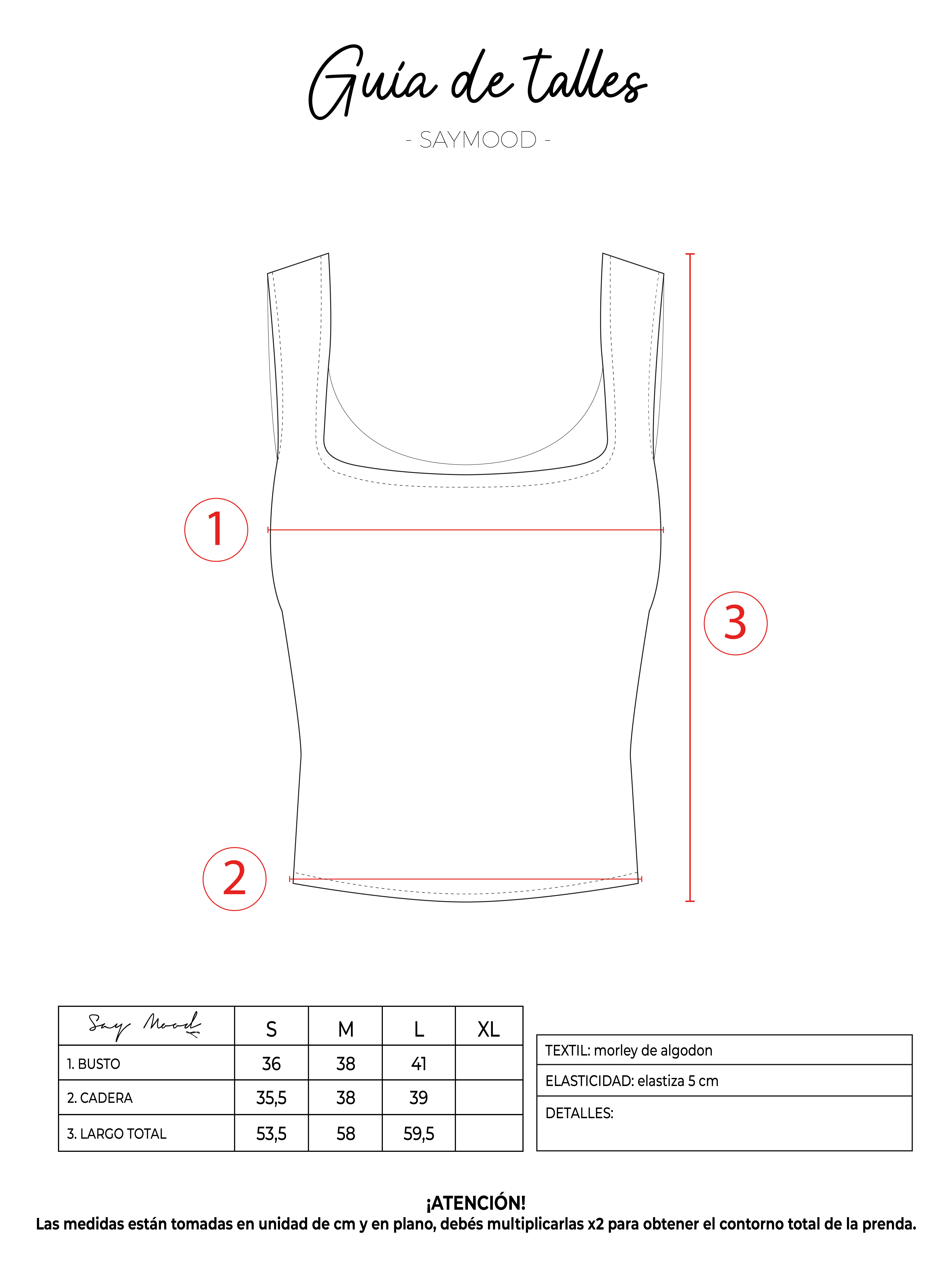 SAYTIPS: chequeá con atención nuestra tabla de talles para encontrar el que mejor vaya con vos. Podés tomar como referencia una prenda similar que tengas para mayor seguridad 😉