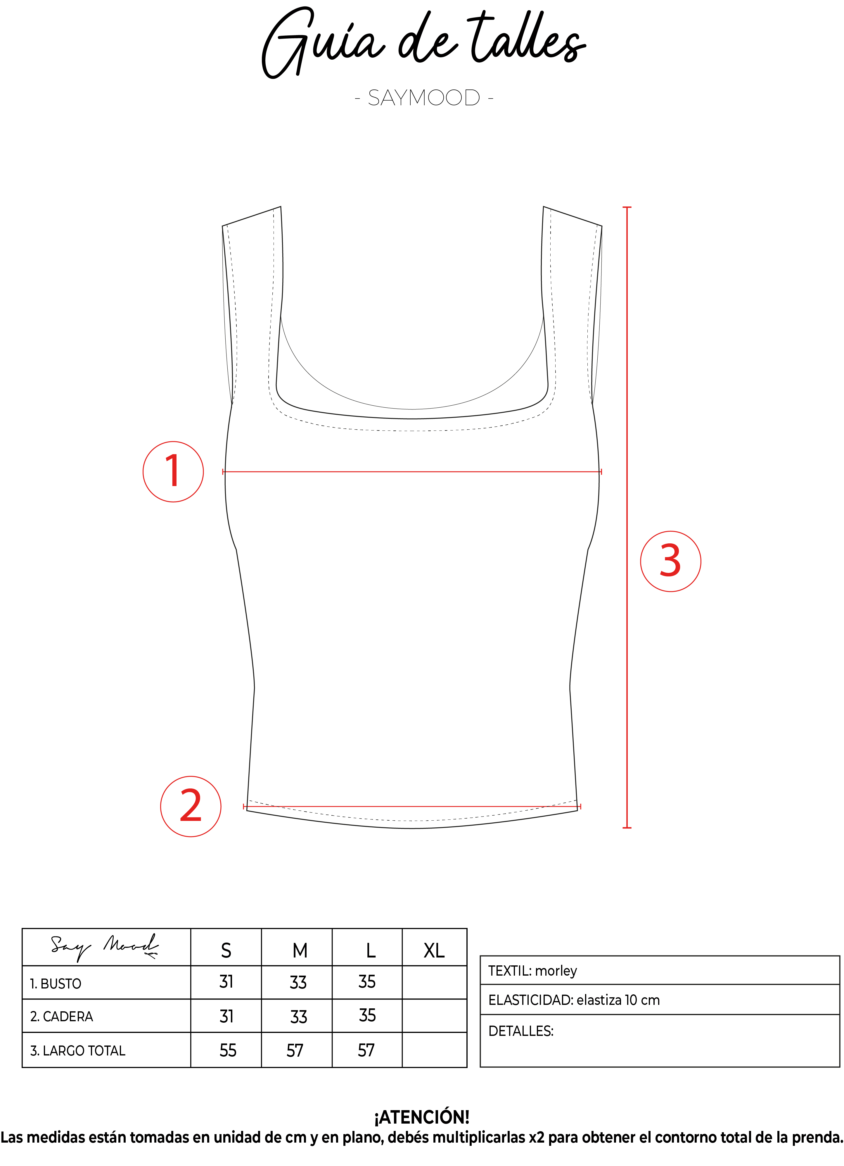 SAYTIPS: chequeá con atención nuestra tabla de talles para encontrar el que mejor vaya con vos. Podés tomar como referencia una prenda similar que tengas para mayor seguridad.