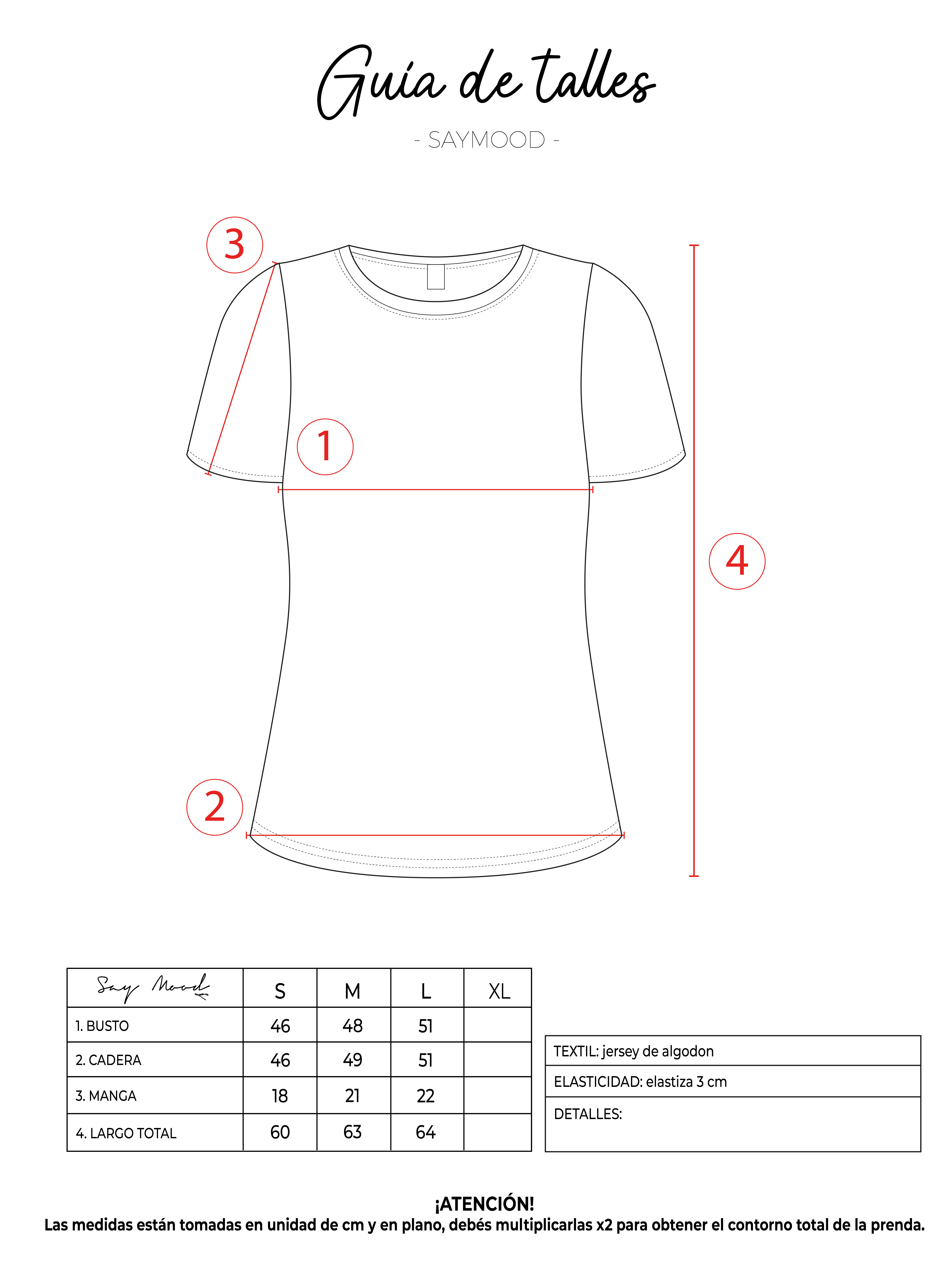 SAYTIPS: chequeá con atención nuestra tabla de talles para encontrar el que mejor vaya con vos. Podés tomar como referencia una prenda similar que tengas para mayor seguridad 😉