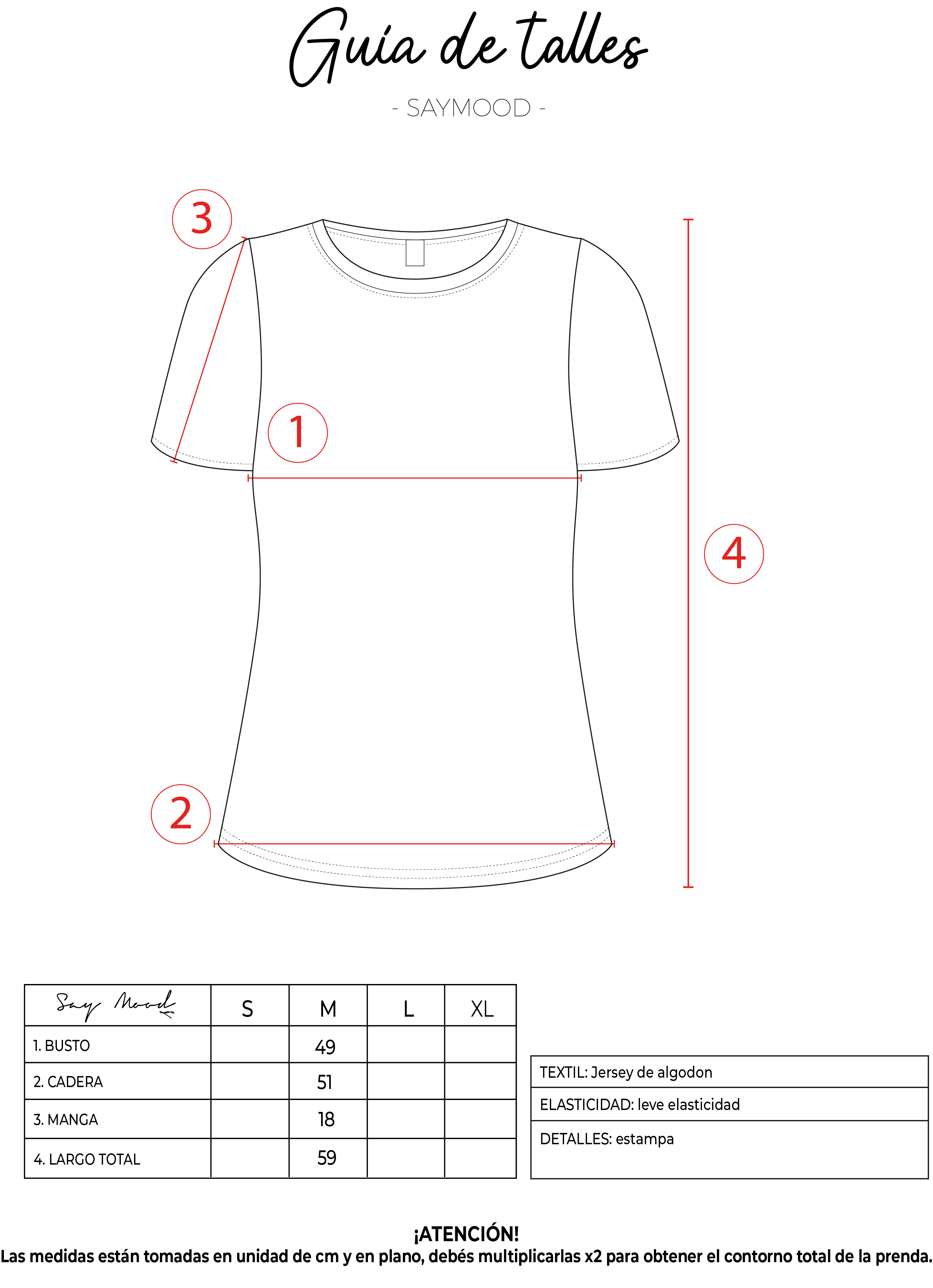 SAYTIPS: chequeá con atención nuestra tabla de talles para encontrar el que mejor vaya con vos. Podés tomar como referencia una prenda similar que tengas para mayor seguridad 😉