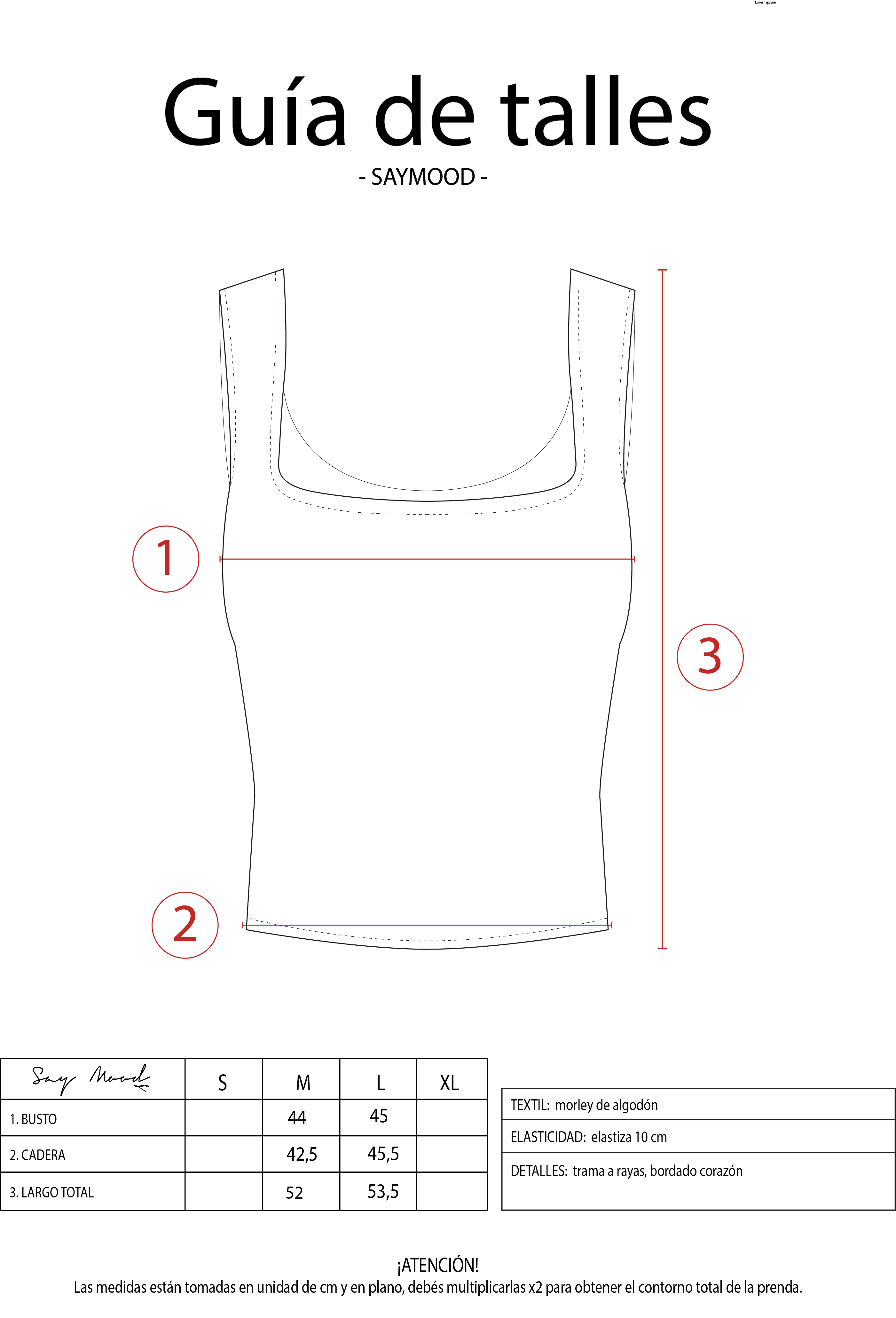 SAYTIPS: chequeá con atención nuestra tabla de talles para encontrar el que mejor vaya con vos. Podés tomar como referencia una prenda similar que tengas para mayor seguridad 😉