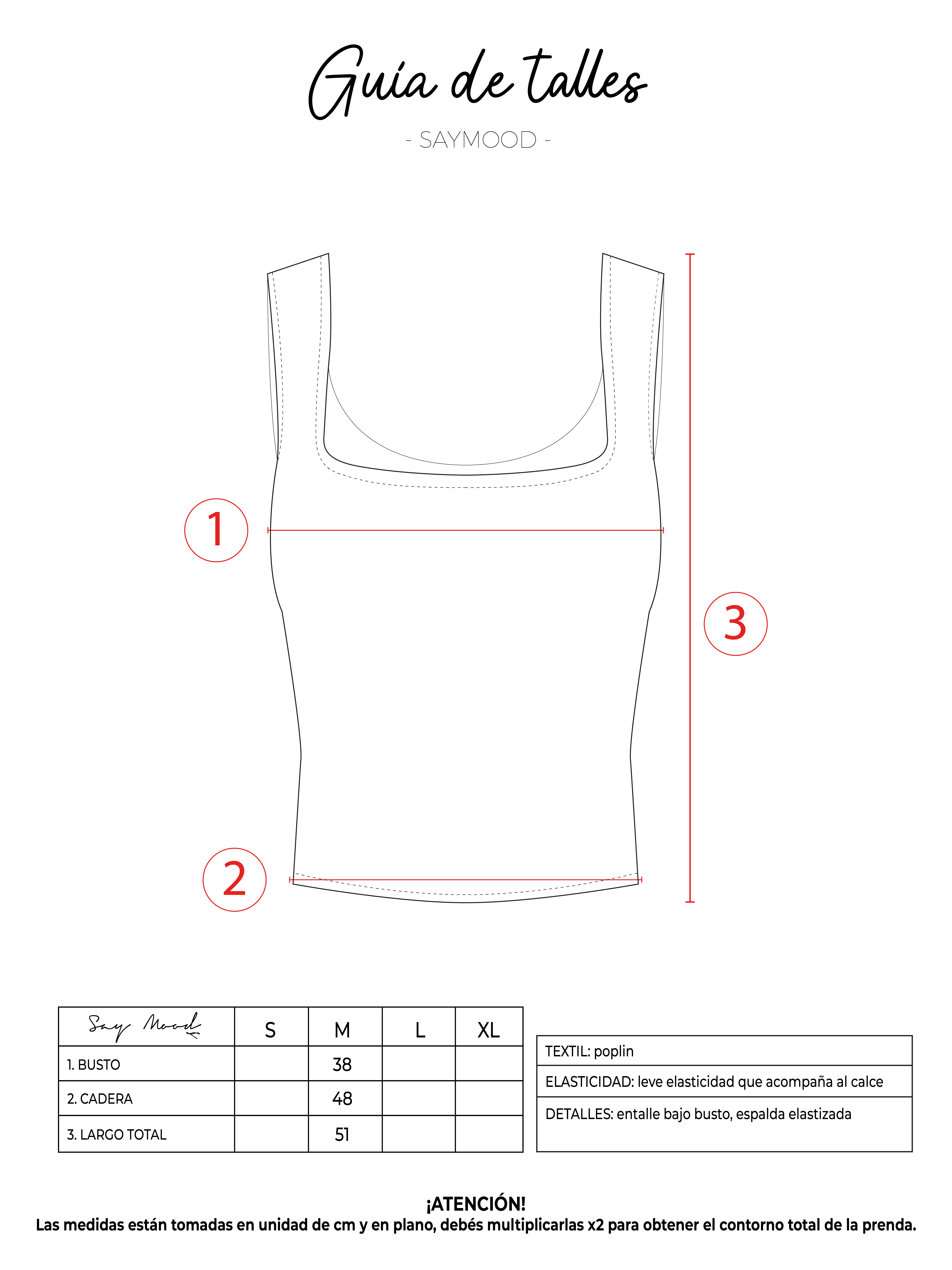SAYTIPS: chequeá con atención nuestra tabla de talles para encontrar el que mejor vaya con vos. Podés tomar como referencia una prenda similar que tengas para mayor seguridad 😉