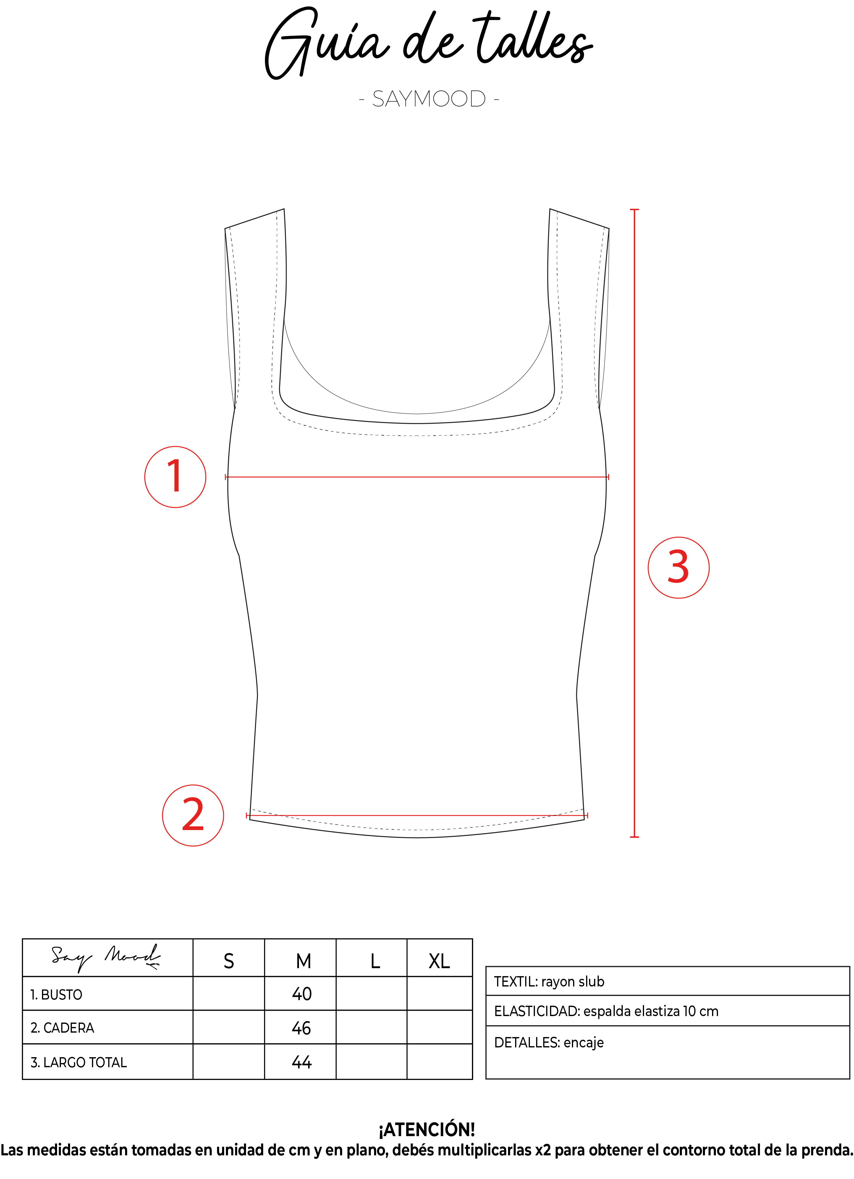 SAYTIPS: chequeá con atención nuestra tabla de talles para encontrar el que mejor vaya con vos. Podés tomar como referencia una prenda similar que tengas para mayor seguridad 😉