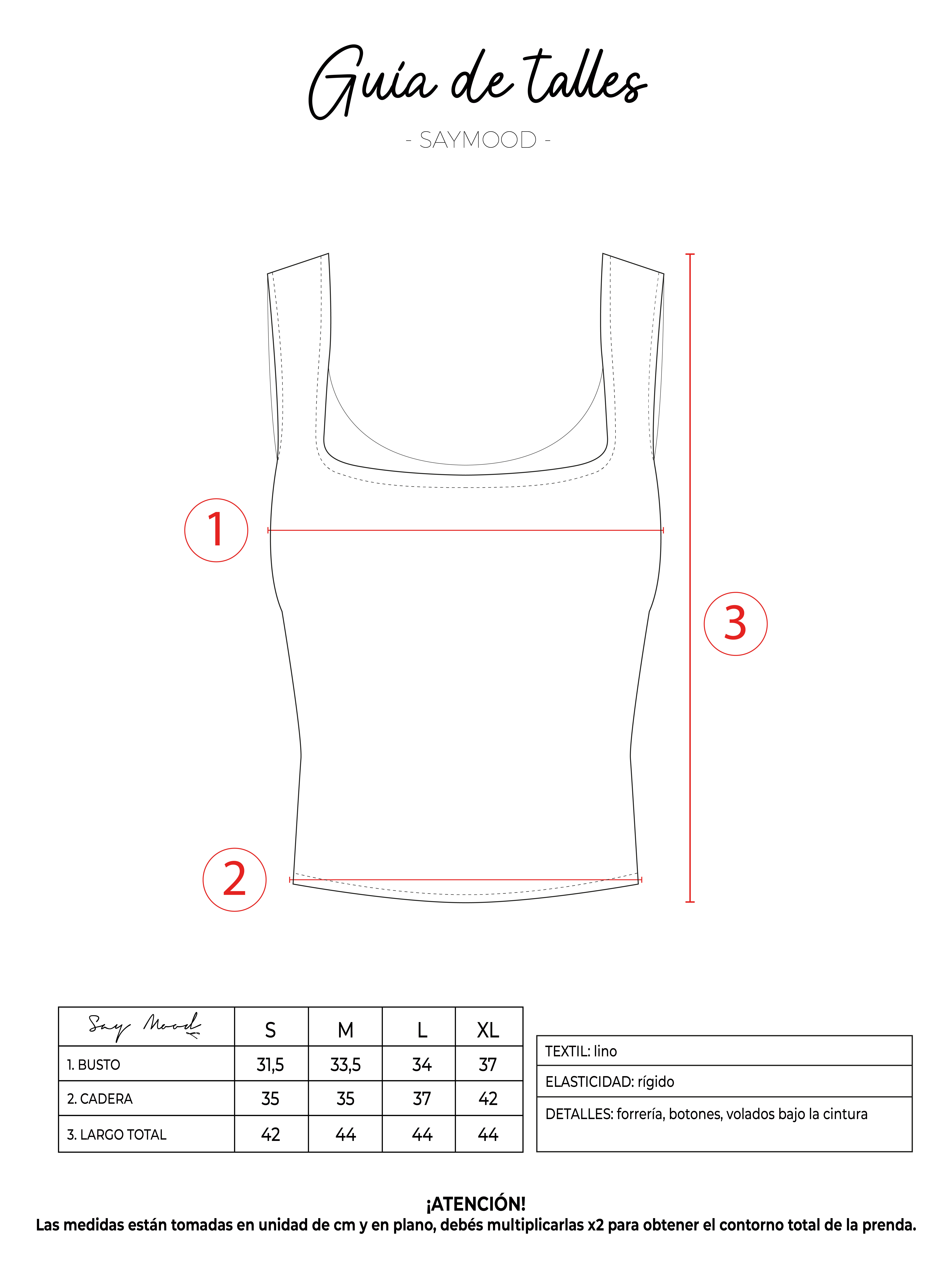 SAYTIPS: chequeá con atención nuestra tabla de talles para encontrar el que mejor vaya con vos. Podés tomar como referencia una prenda similar que tengas para mayor seguridad 😉