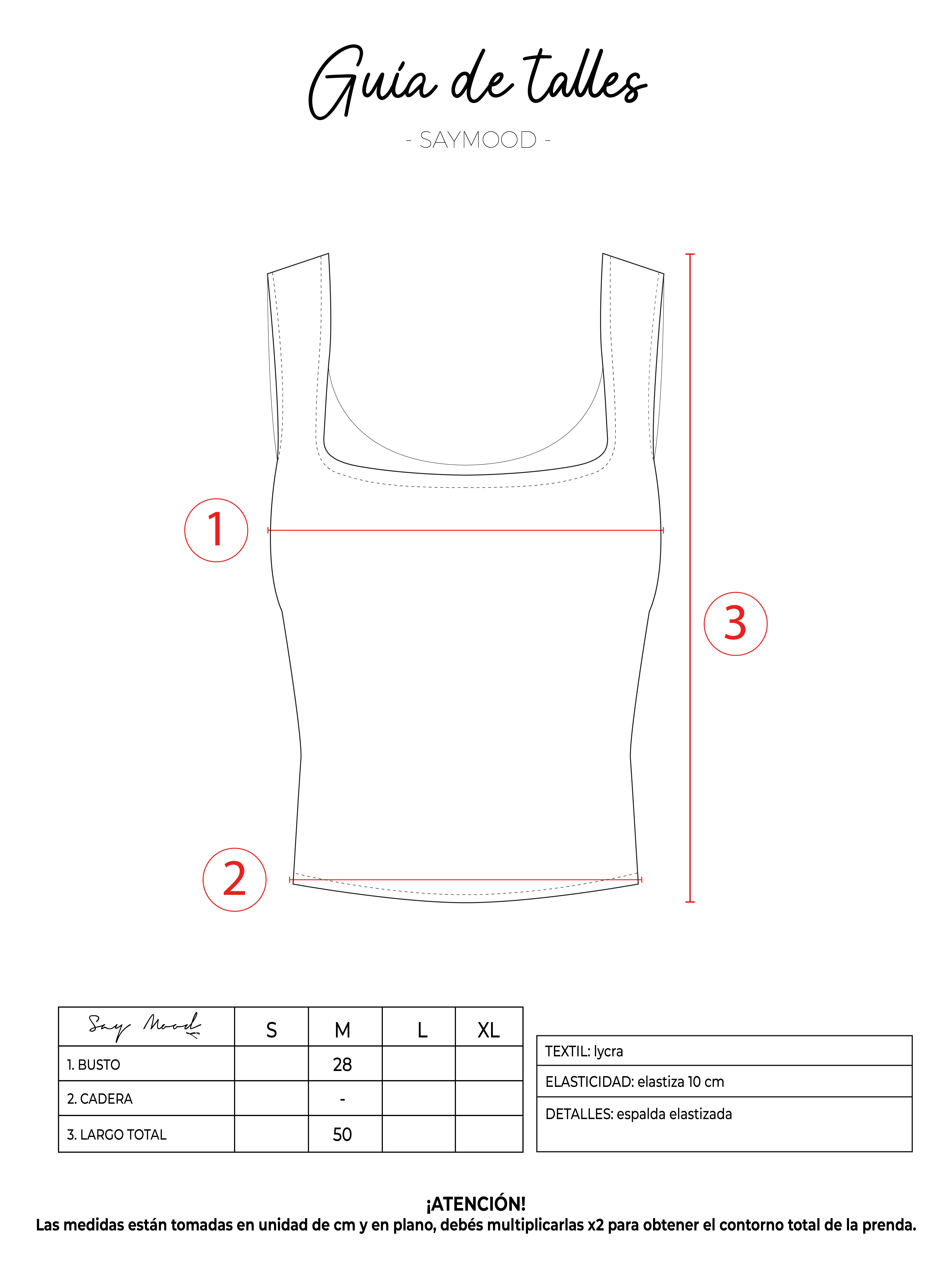 SAYTIPS: chequeá con atención nuestra tabla de talles para encontrar el que mejor vaya con vos. Podés tomar como referencia una prenda similar que tengas para mayor seguridad 😉