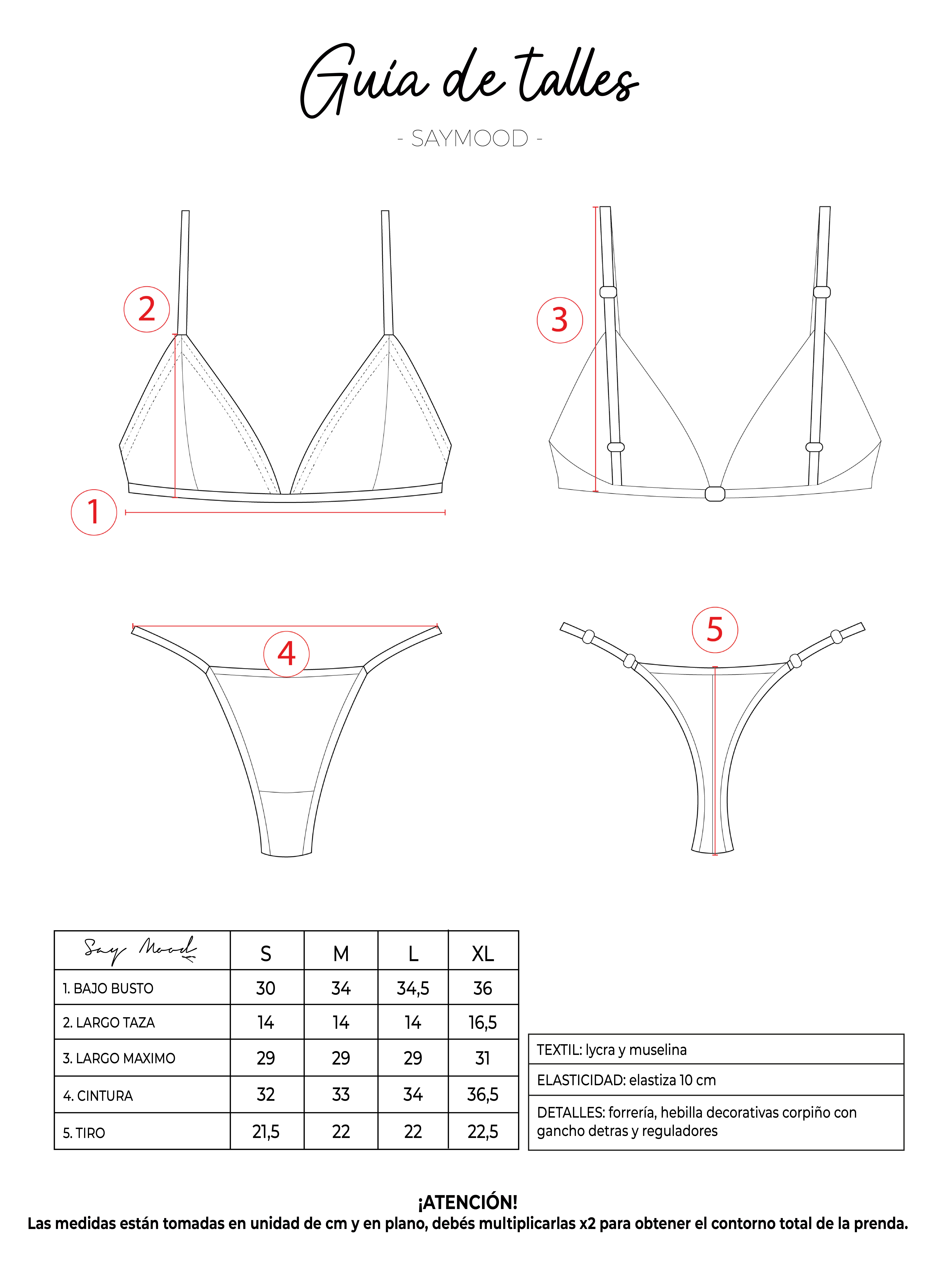 SAYTIPS: chequeá con atención nuestra tabla de talles para encontrar el que mejor vaya con vos. Podés tomar como referencia una prenda similar que tengas para mayor seguridad 😉 Tené en cuenta que la medida 3 está tomada en la máxima extensión de los reguladores.