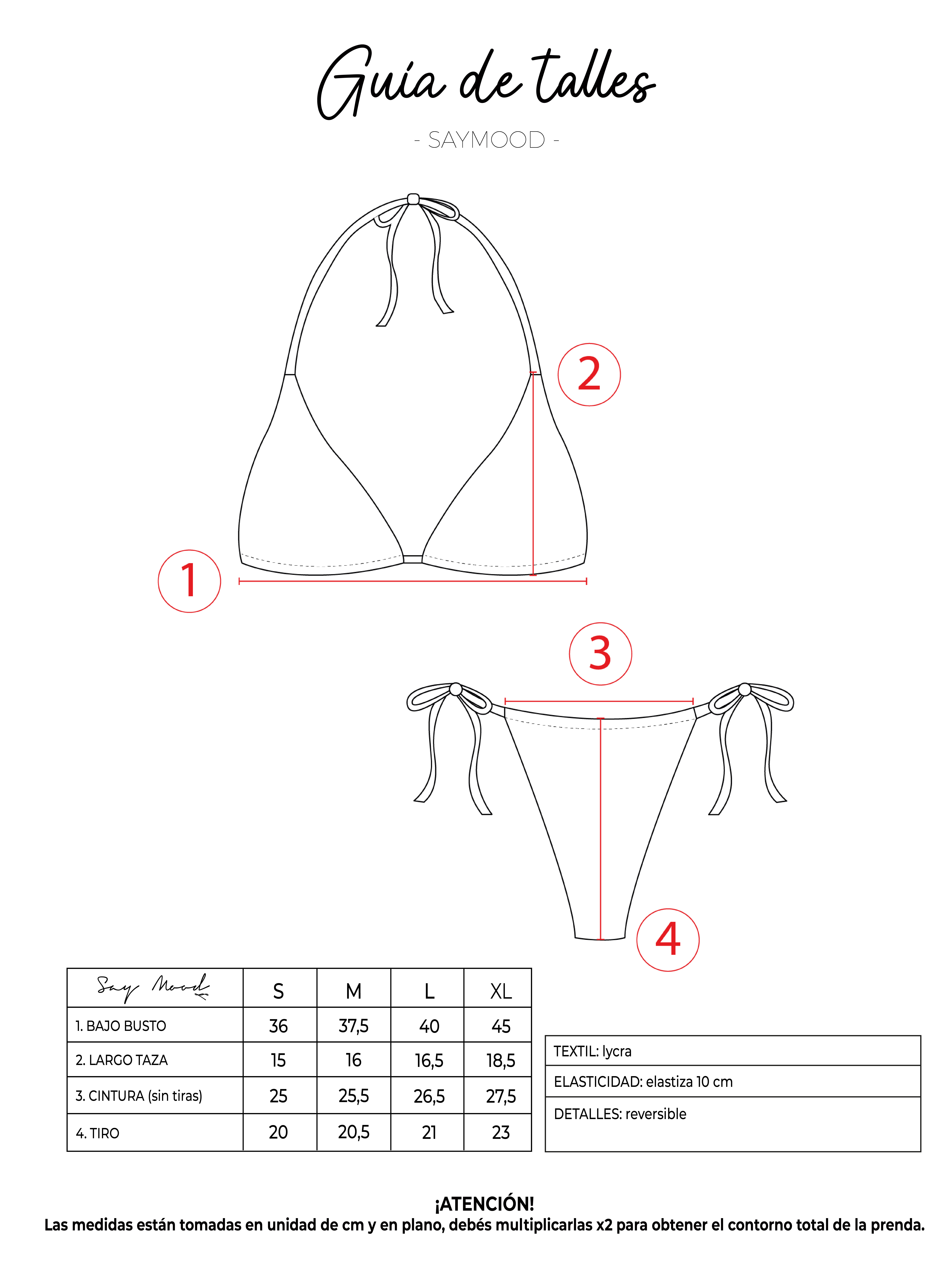 SAYTIPS: chequeá con atención nuestra tabla de talles para encontrar el que mejor vaya con vos. Podés tomar como referencia una prenda similar que tengas para mayor seguridad 😉 tené en cuenta que la medida 3 no comprende las tiritas para atar.