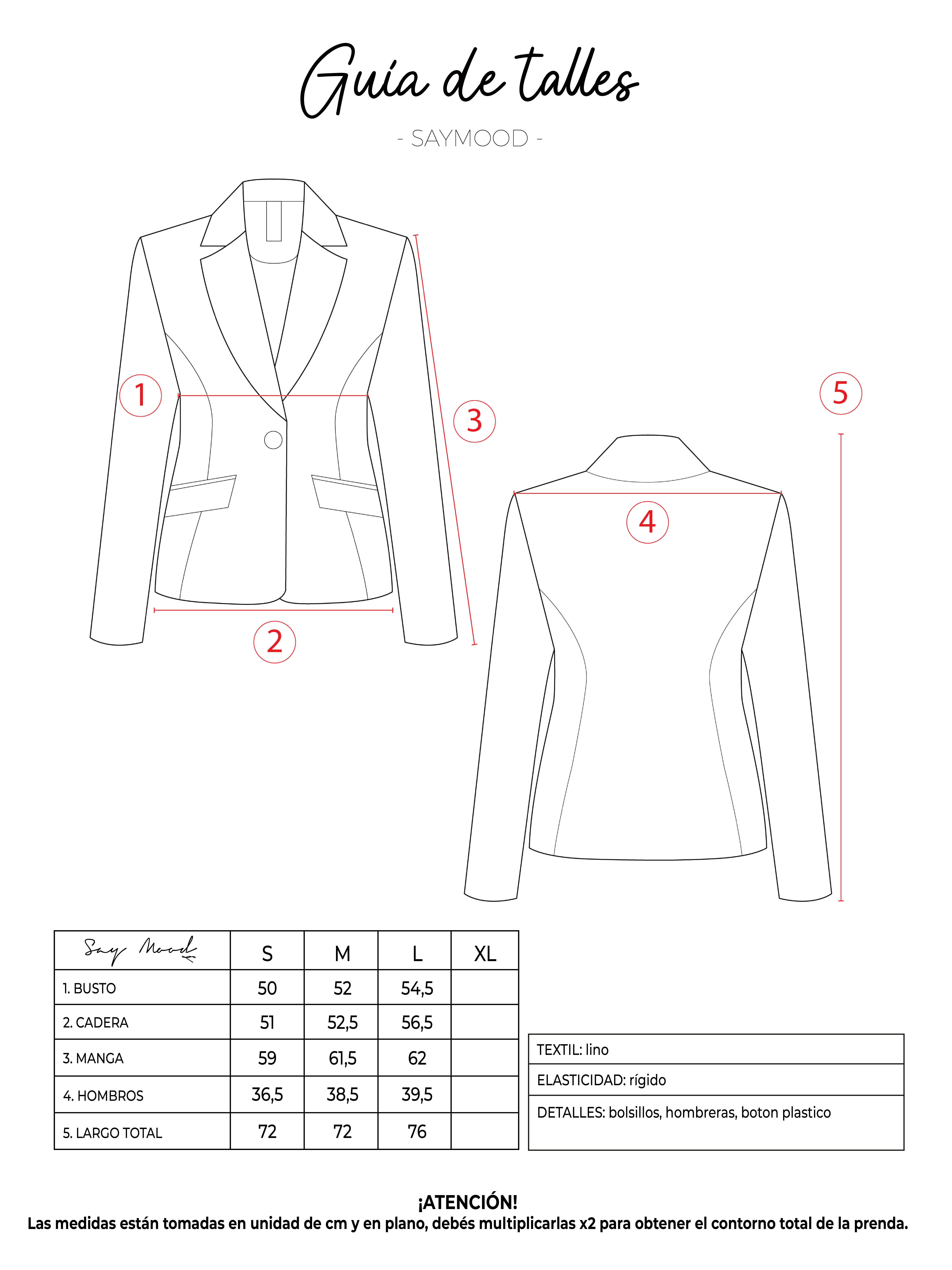 SAYTIPS: chequeá con atención nuestra tabla de talles para encontrar el que mejor vaya con vos. Podés tomar como referencia una prenda similar que tengas para mayor seguridad 😉 hey! por naturaleza del textil, las prendas de lino pueden contener fibras de otro color en su tejido, viéndose como una linea un poco más oscura. No aceptamos reclamos relacionados, ya que no constituye una falla.