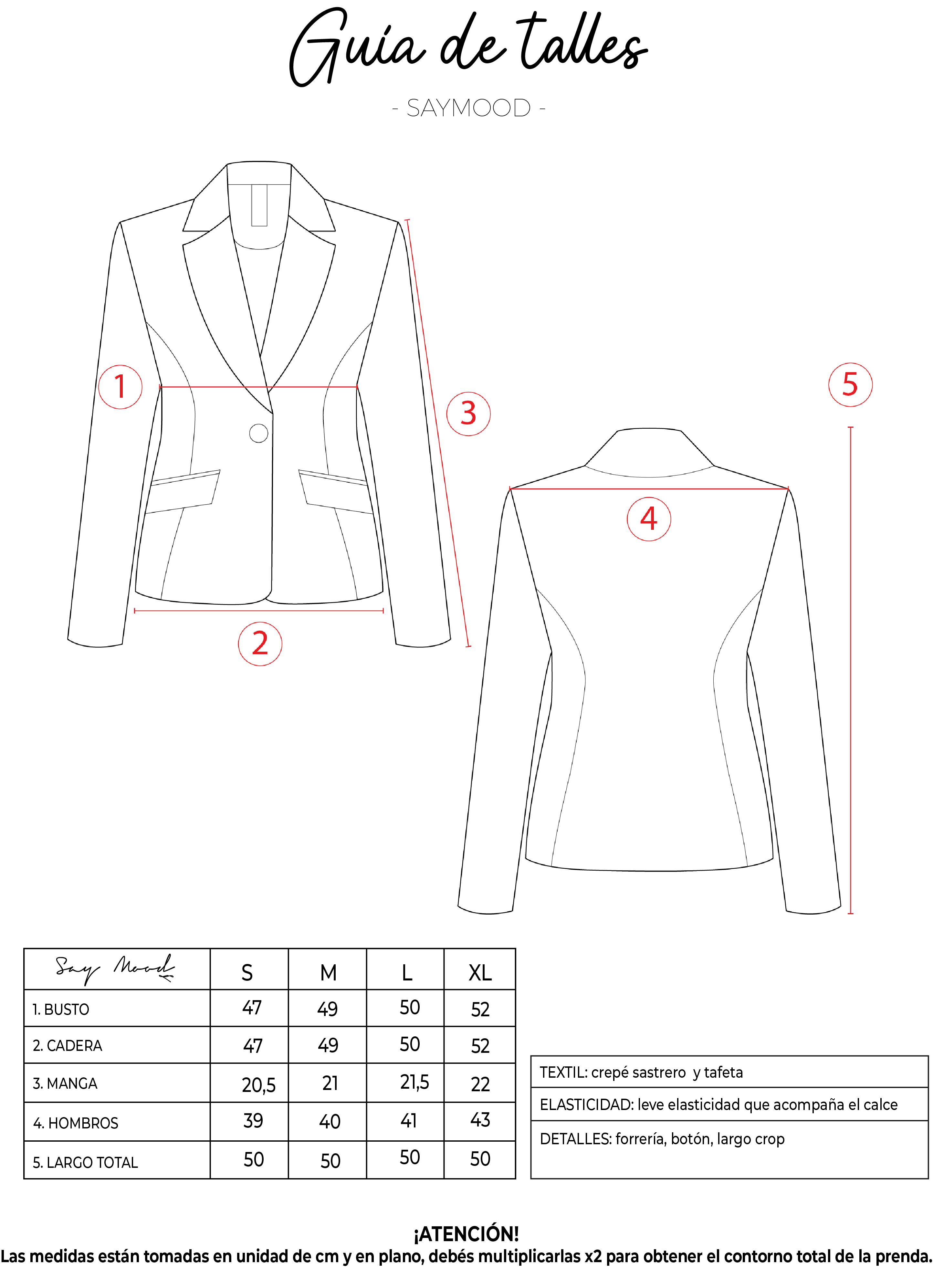 Say Sastreria. Marina es la pieza sastrera que necesitas para el verano! mixea la moldería más prolija, con un largo crop y mangas cortas. La silueta es amplia, calza perfecto gracias a su estructura con hombreras, es largo bajo la cintura aprox., con un cuello smoking súper distinguido y cierre por botón. Confeccionado en nuestro clásico textil sastrero, con forrería para elevar la calidad.