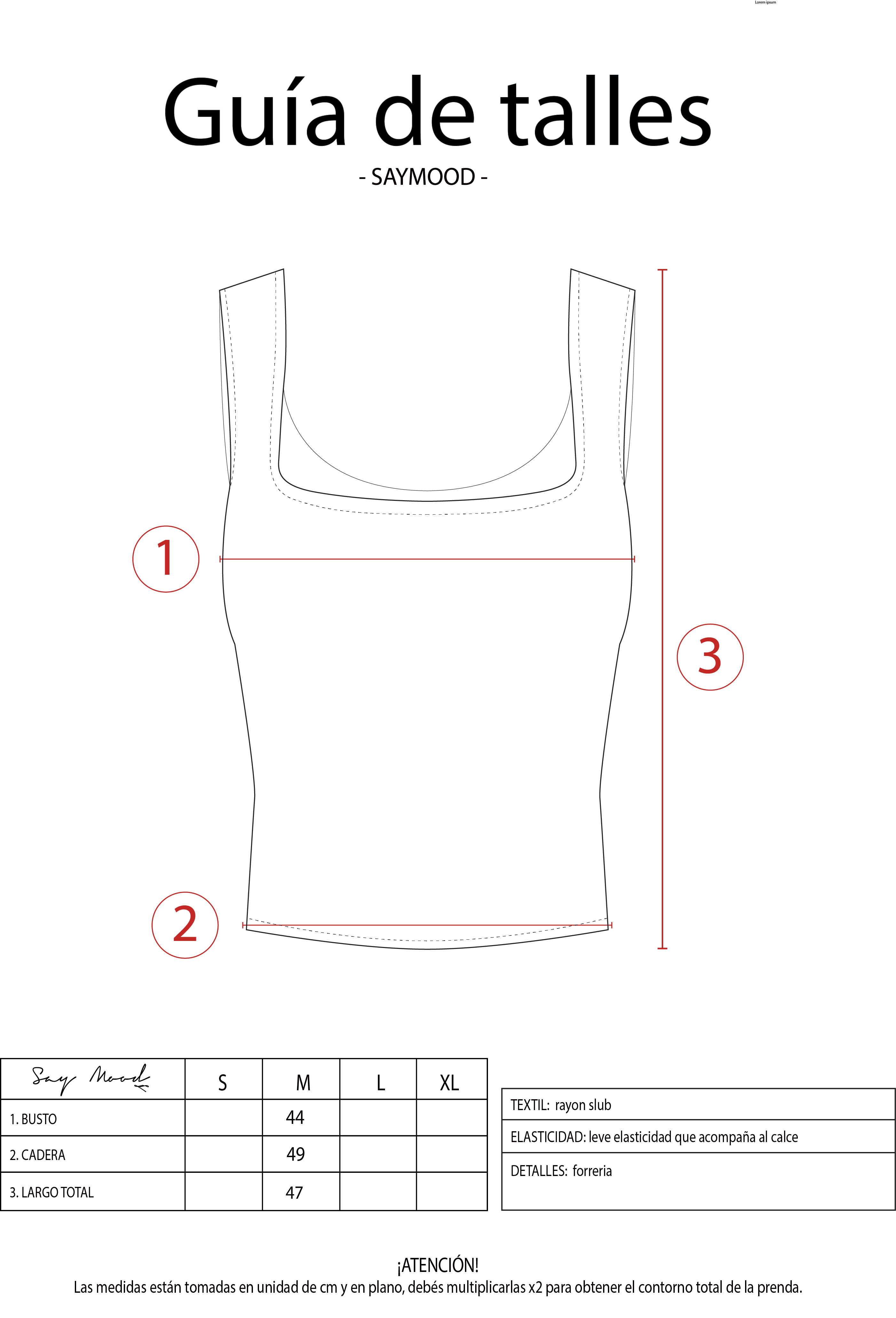 SAYTIPS: chequeá con atención nuestra tabla de talles para encontrar el que mejor vaya con vos. Podés tomar como referencia una prenda similar que tengas para mayor seguridad 😉
