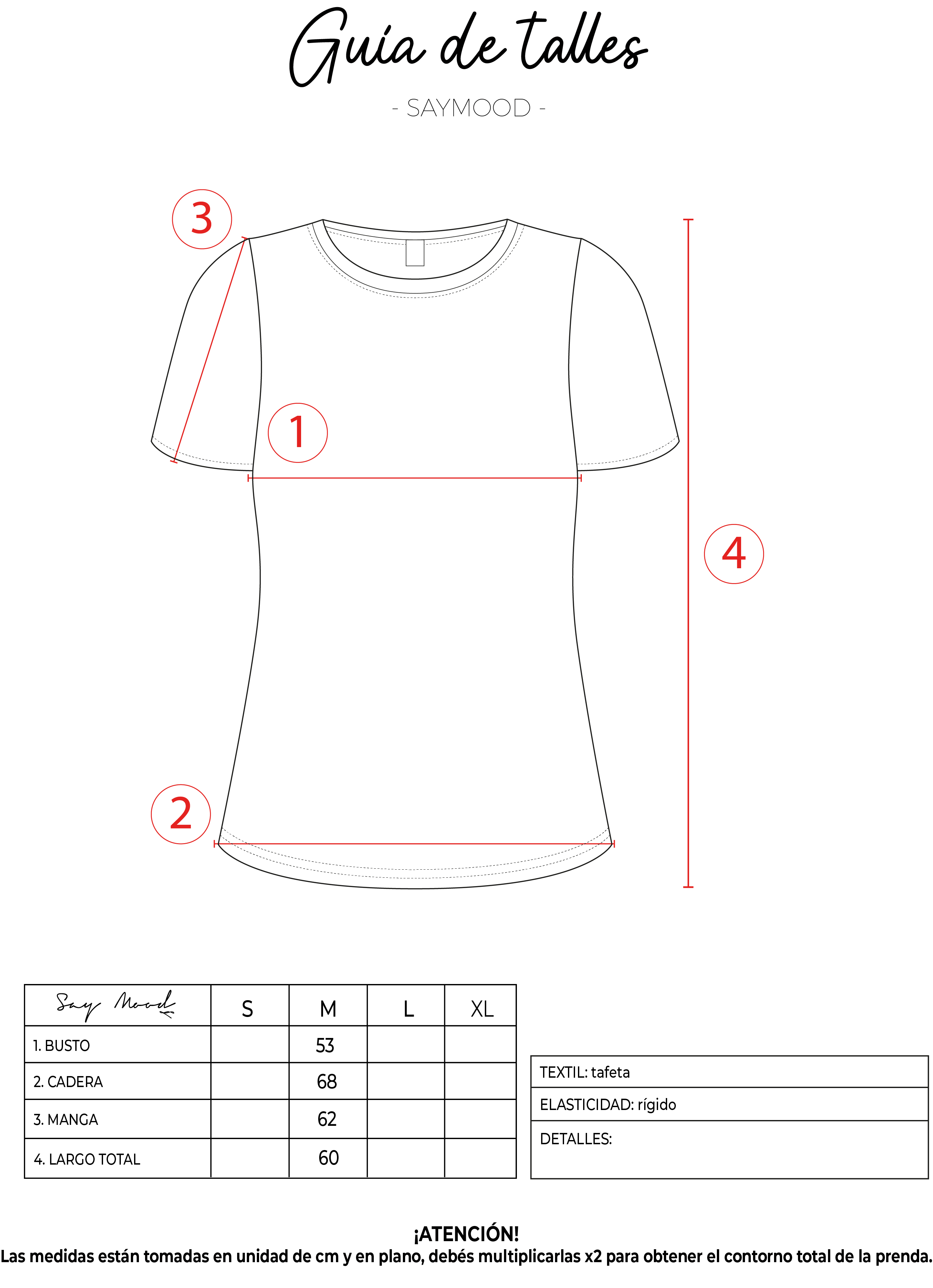 SAYTIPS: chequeá con atención nuestra tabla de talles para encontrar el que mejor vaya con vos. Podés tomar como referencia una prenda similar que tengas para mayor seguridad 😉