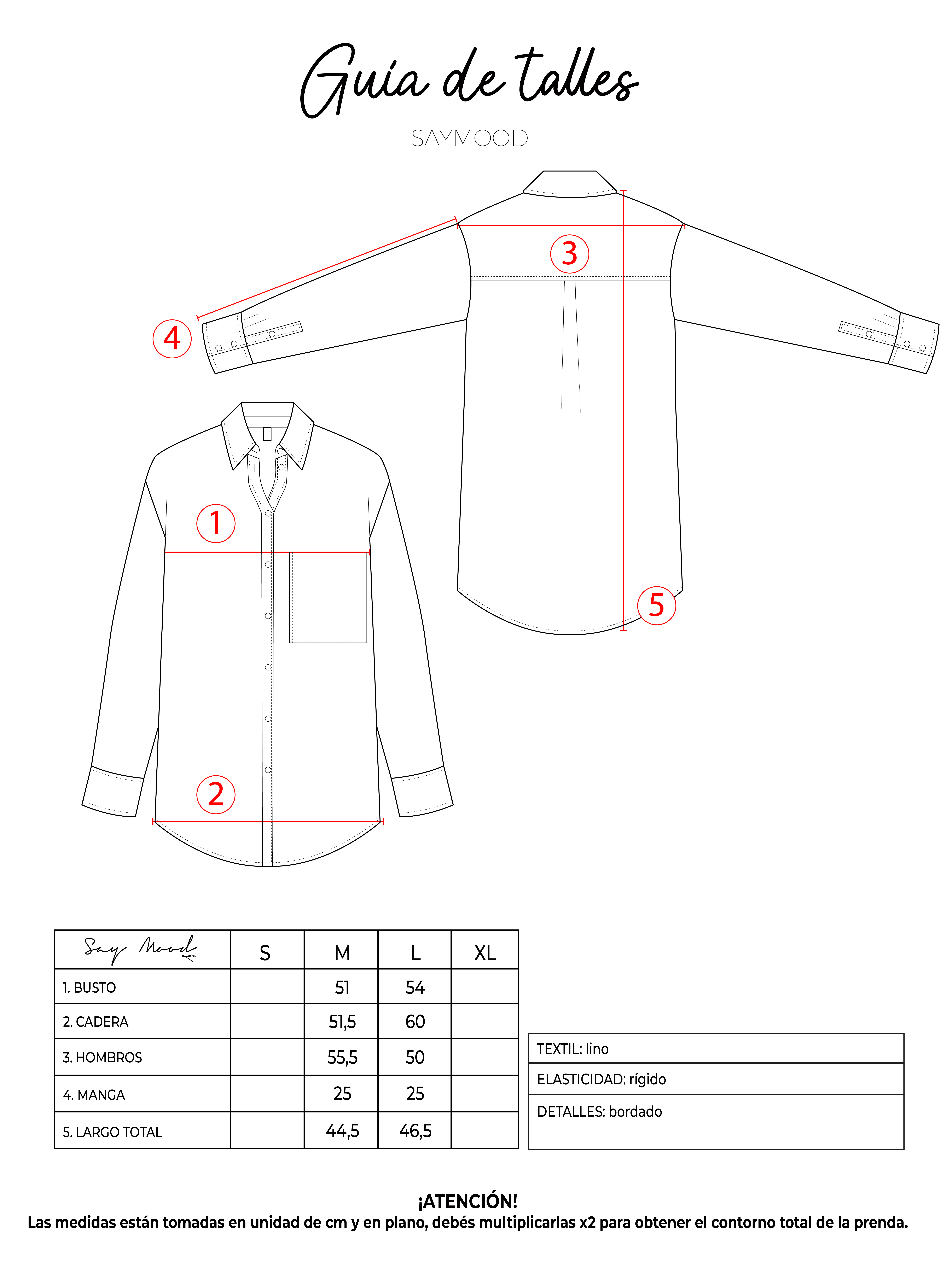 SAYTIPS: chequeá con atención nuestra tabla de talles para encontrar el que mejor vaya con vos. Podés tomar como referencia una prenda similar que tengas para mayor seguridad 😉