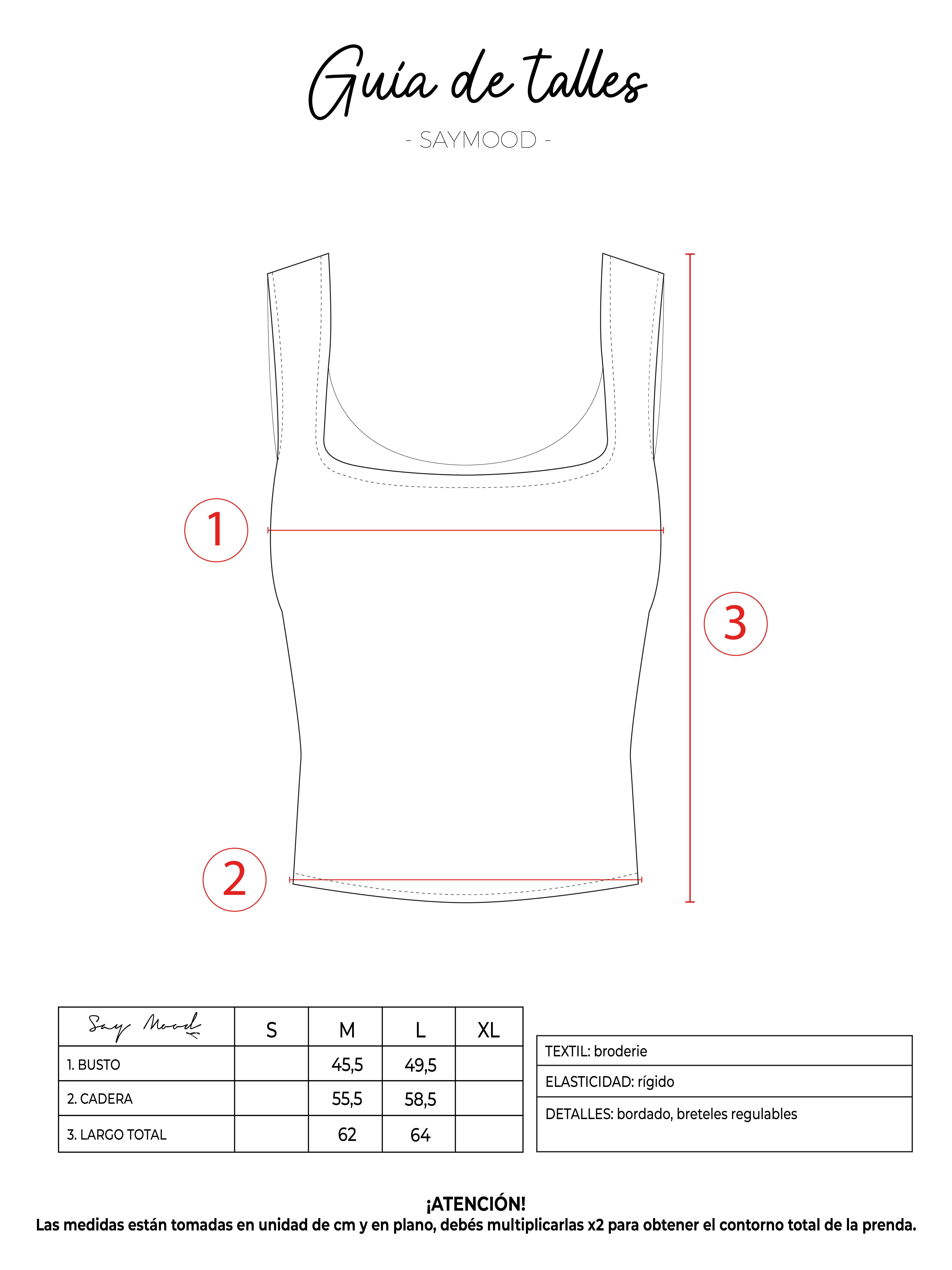 SAYTIPS: chequeá con atención nuestra tabla de talles para encontrar el que mejor vaya con vos. Podés tomar como referencia una prenda similar que tengas para mayor seguridad 😉