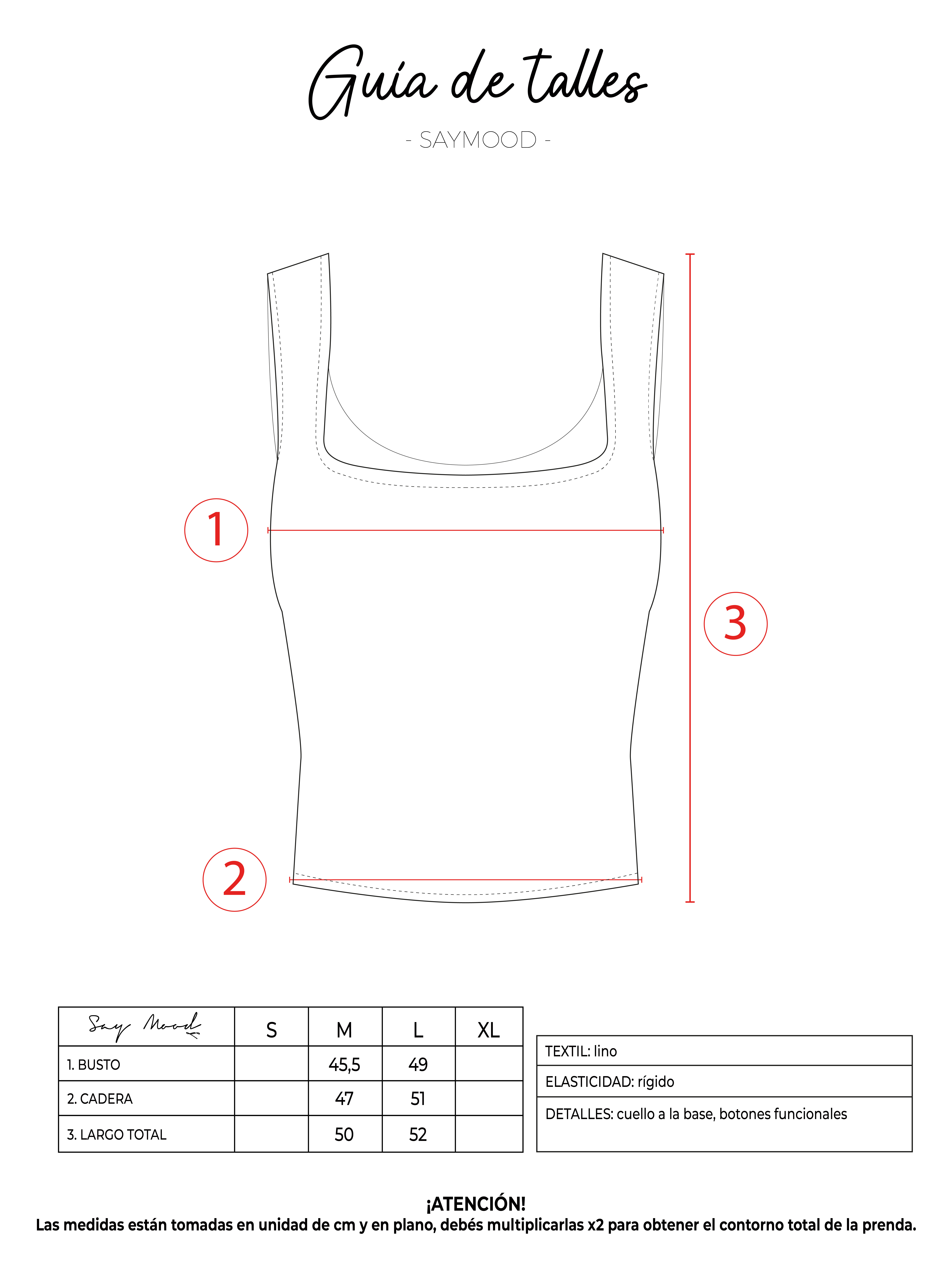 SAYTIPS: chequeá con atención nuestra tabla de talles para encontrar el que mejor vaya con vos. Podés tomar como referencia una prenda similar que tengas para mayor seguridad 😉