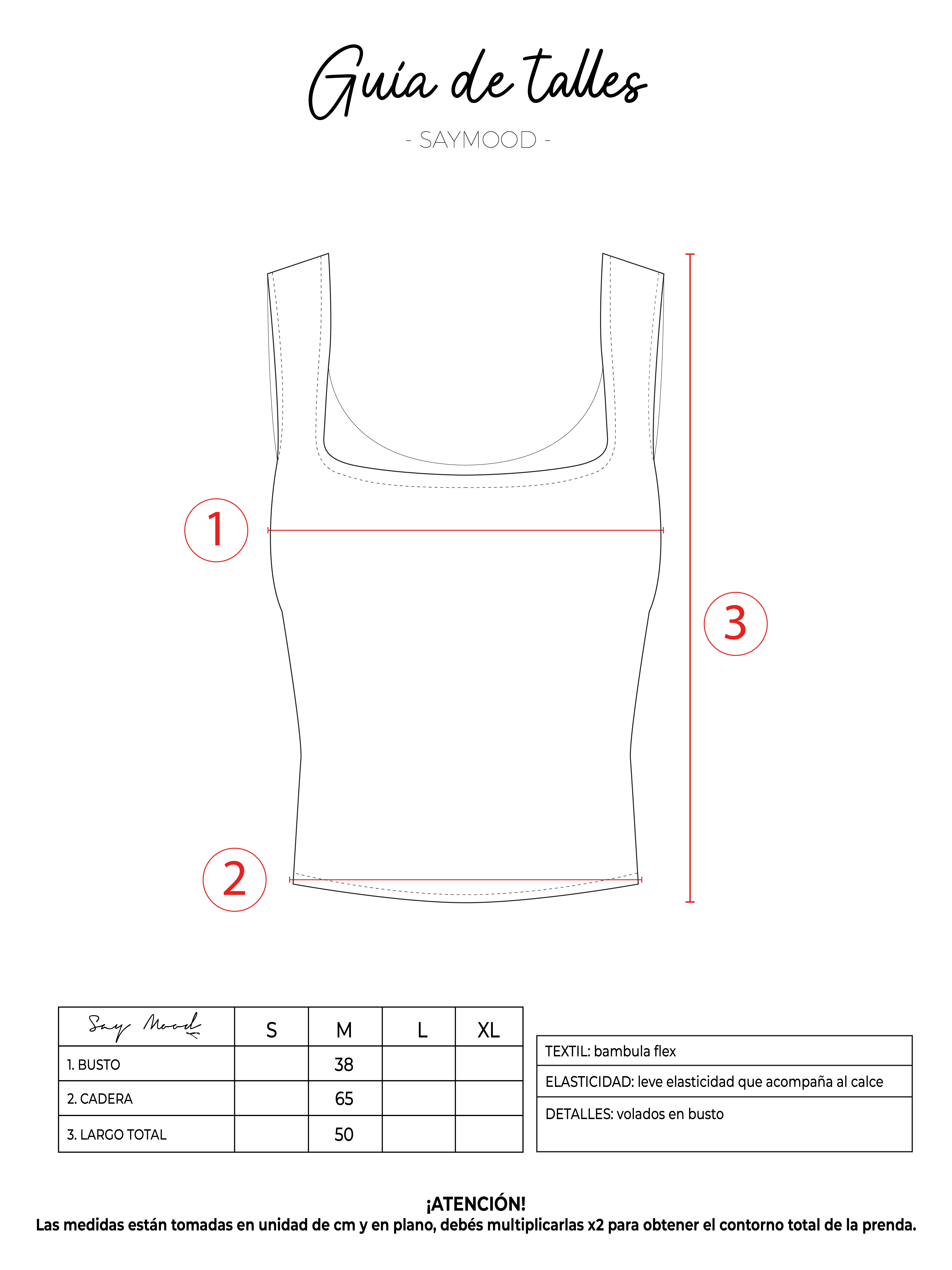 SAYTIPS: chequeá con atención nuestra tabla de talles para encontrar el que mejor vaya con vos. Podés tomar como referencia una prenda similar que tengas para mayor seguridad 😉