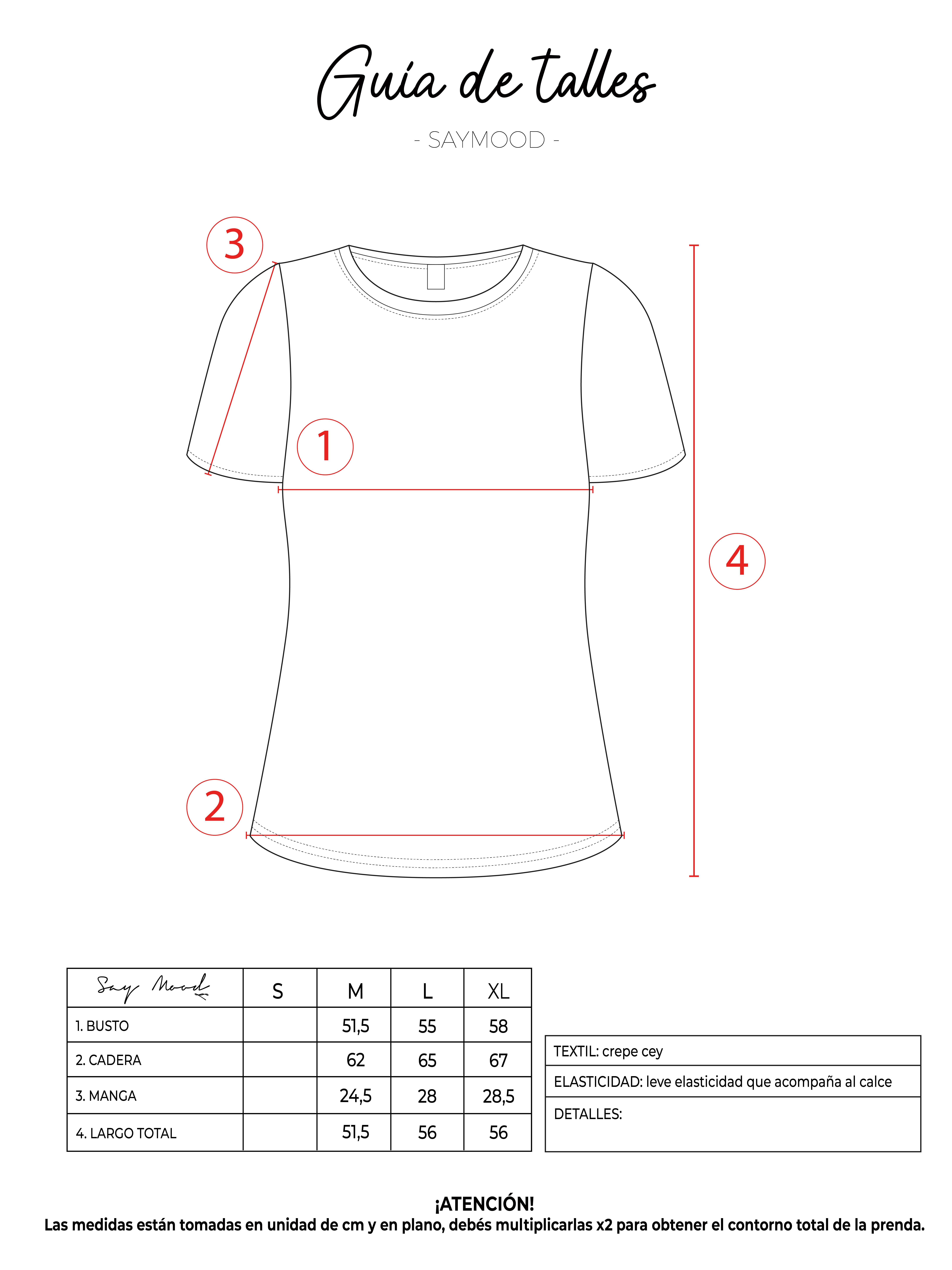 SAYTIPS: chequeá con atención nuestra tabla de talles para encontrar el que mejor vaya con vos. Podés tomar como referencia una prenda similar que tengas para mayor seguridad 😉