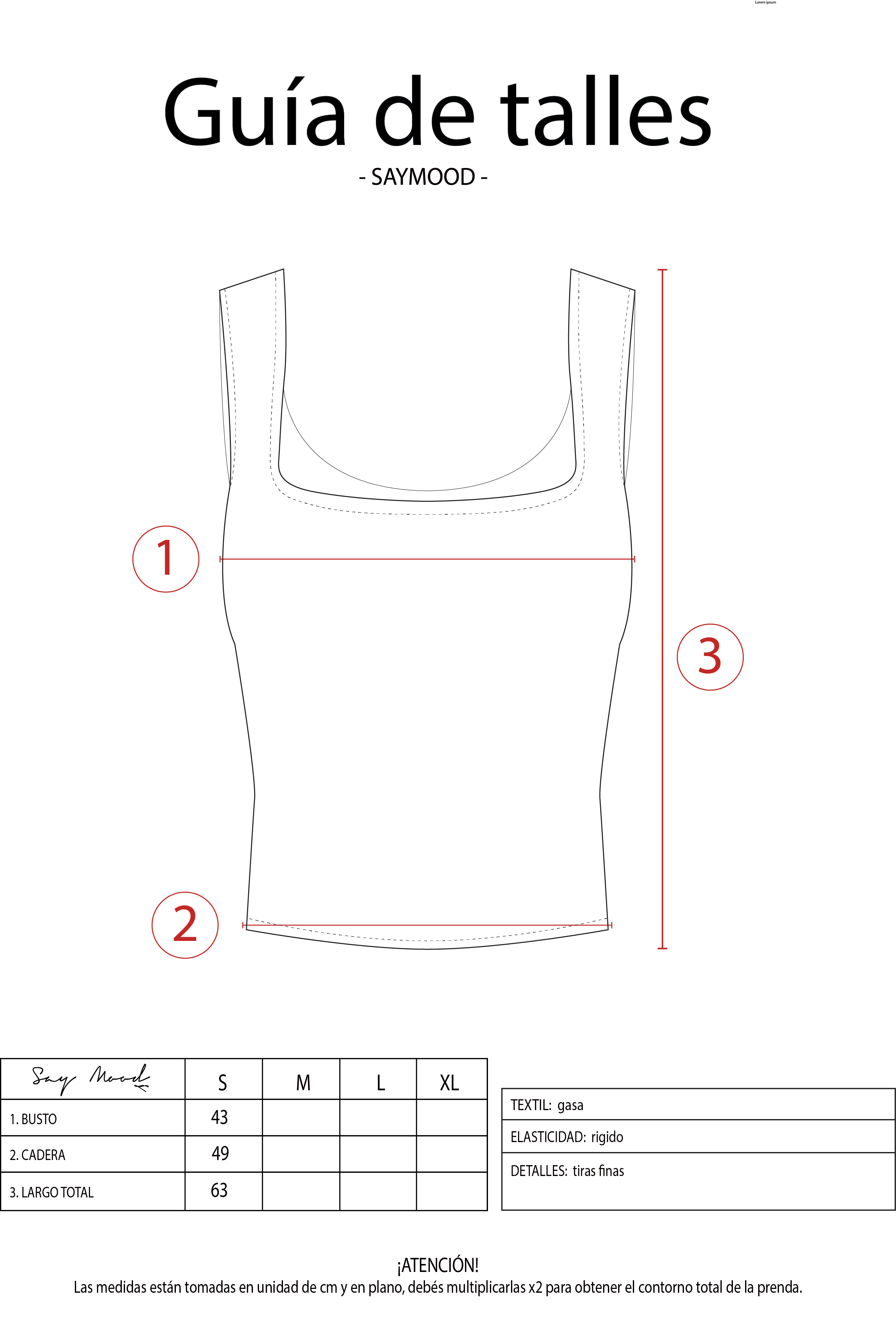 SAYTIPS: chequeá con atención nuestra tabla de talles para encontrar el que mejor vaya con vos. Podés tomar como referencia una prenda similar que tengas para mayor seguridad 😉