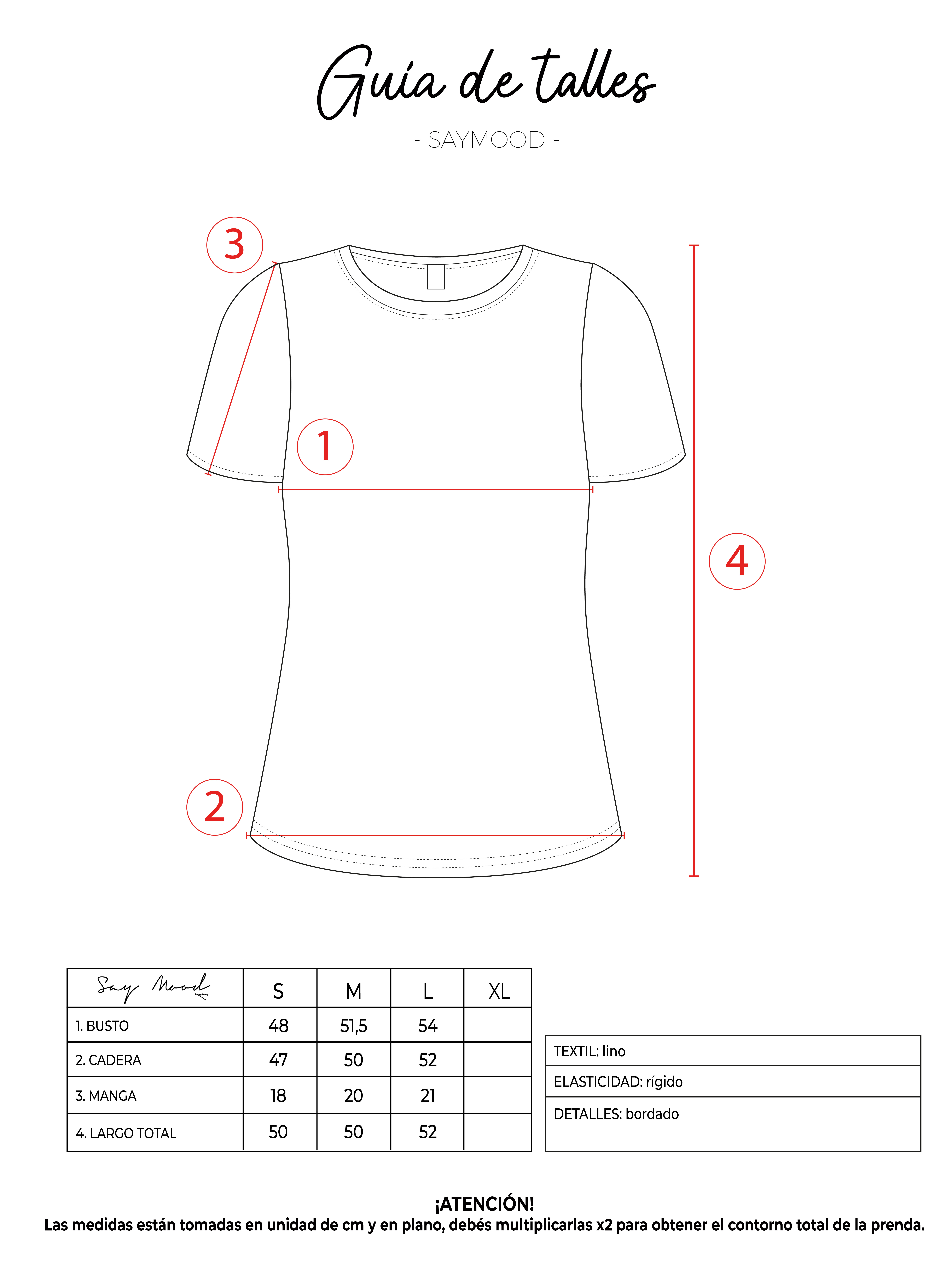 SAYTIPS: chequeá con atención nuestra tabla de talles para encontrar el que mejor vaya con vos. Podés tomar como referencia una prenda similar que tengas para mayor seguridad 😉