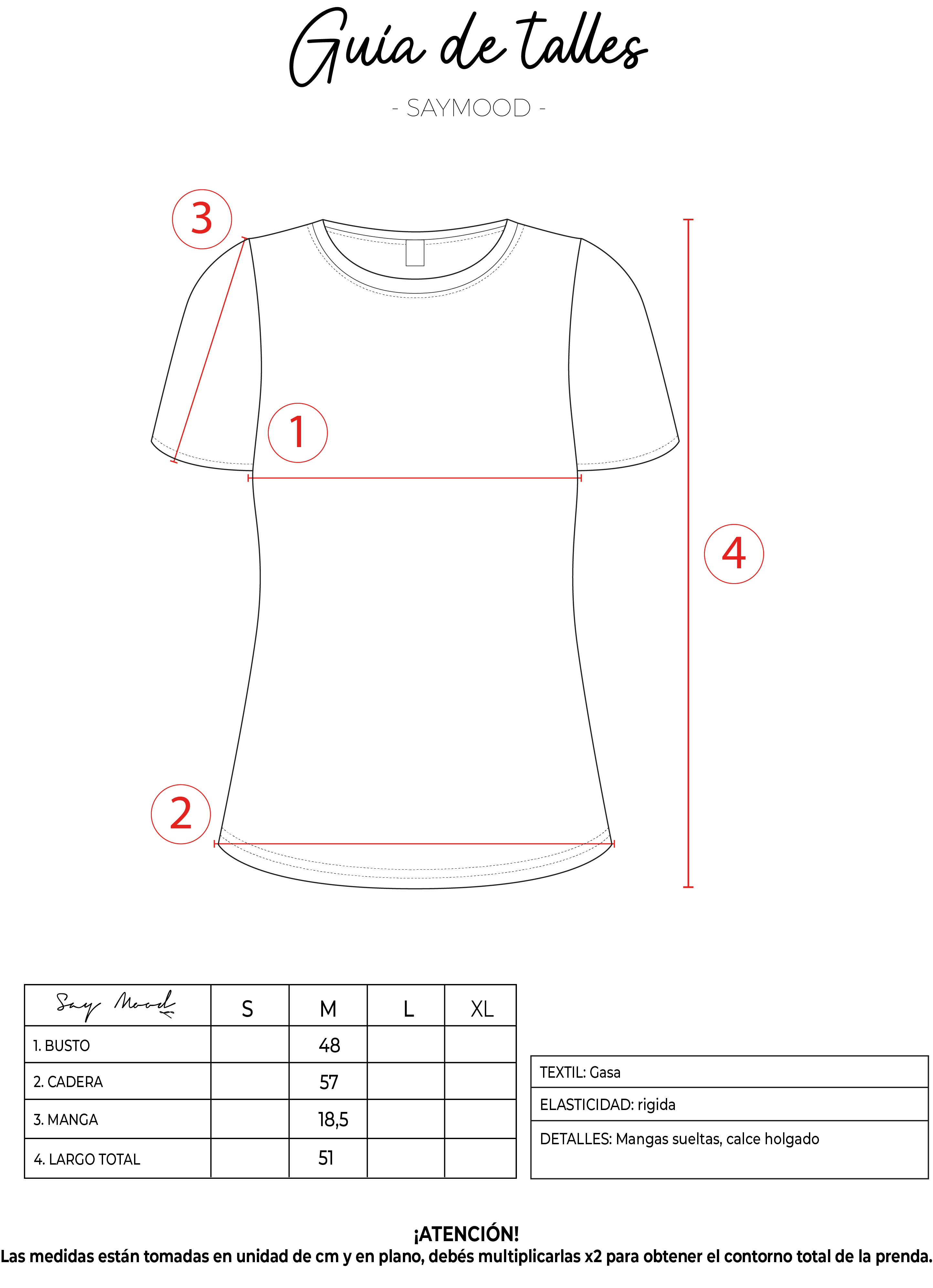 SAYTIPS: chequeá con atención nuestra tabla de talles para encontrar el que mejor vaya con vos. Podés tomar como referencia una prenda similar que tengas para mayor seguridad 😉