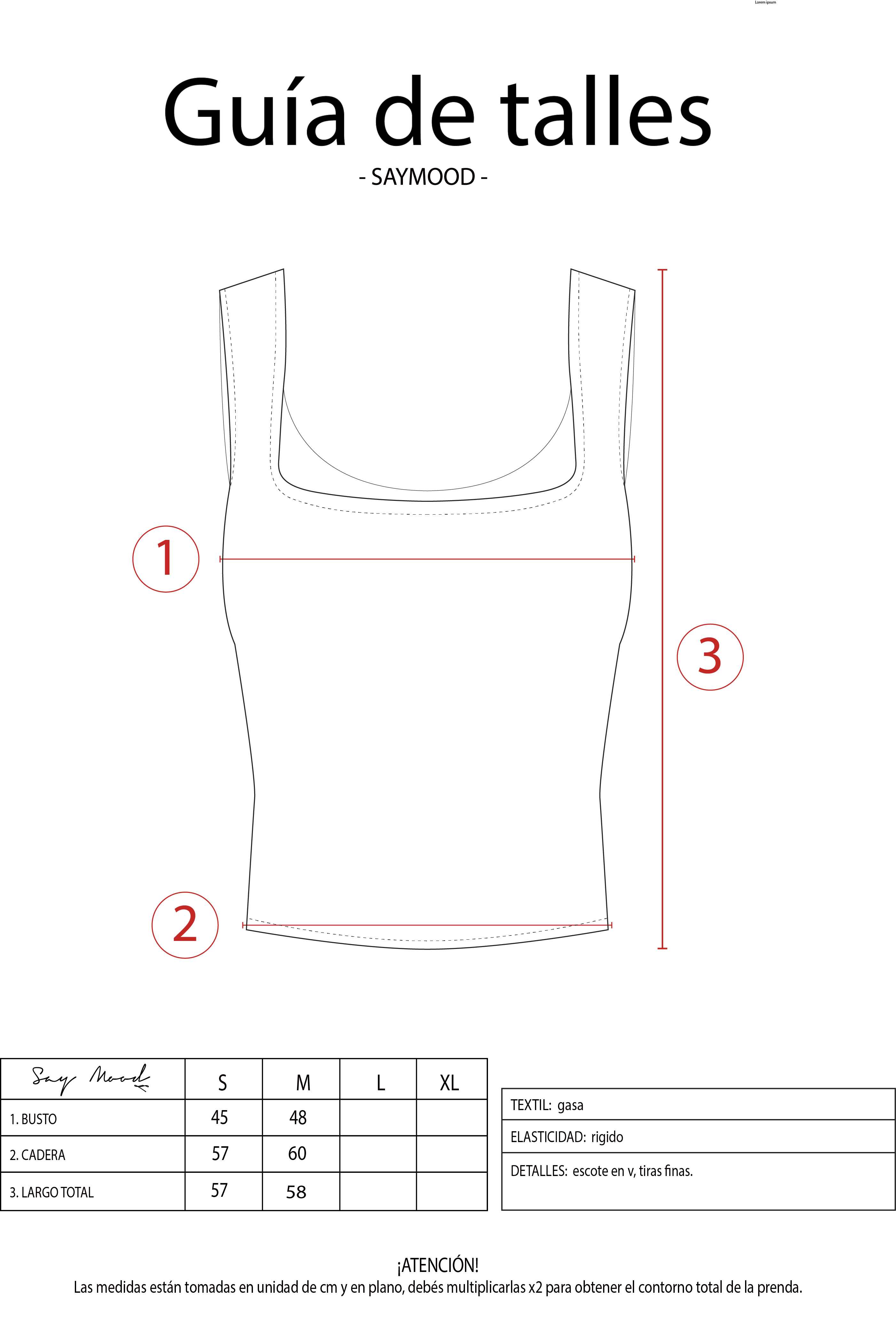 SAYTIPS: chequeá con atención nuestra tabla de talles para encontrar el que mejor vaya con vos. Podés tomar como referencia una prenda similar que tengas para mayor seguridad 😉