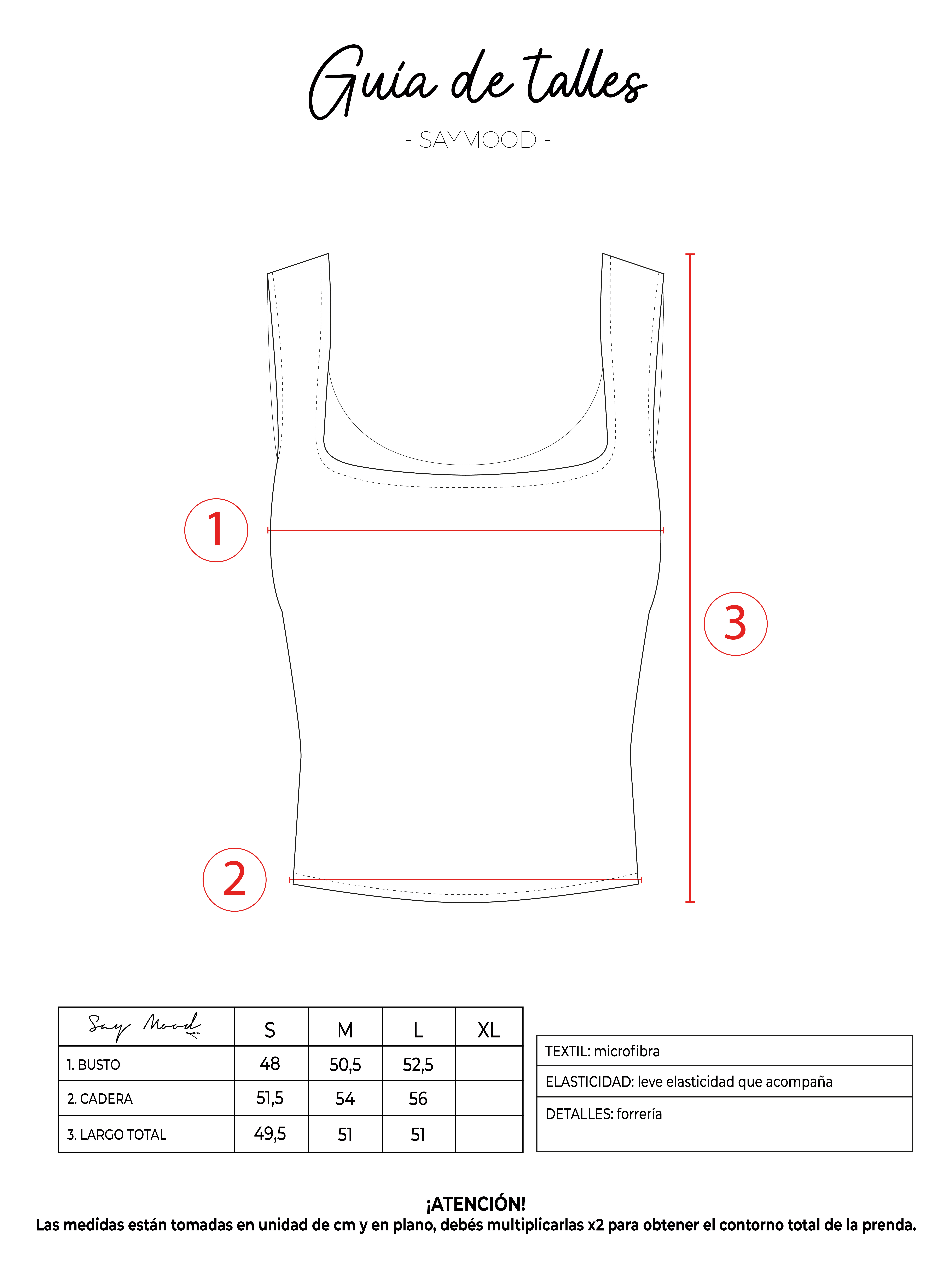 SAYTIPS: chequeá con atención nuestra tabla de talles para encontrar el que mejor vaya con vos. Podés tomar como referencia una prenda similar que tengas para mayor seguridad 😉