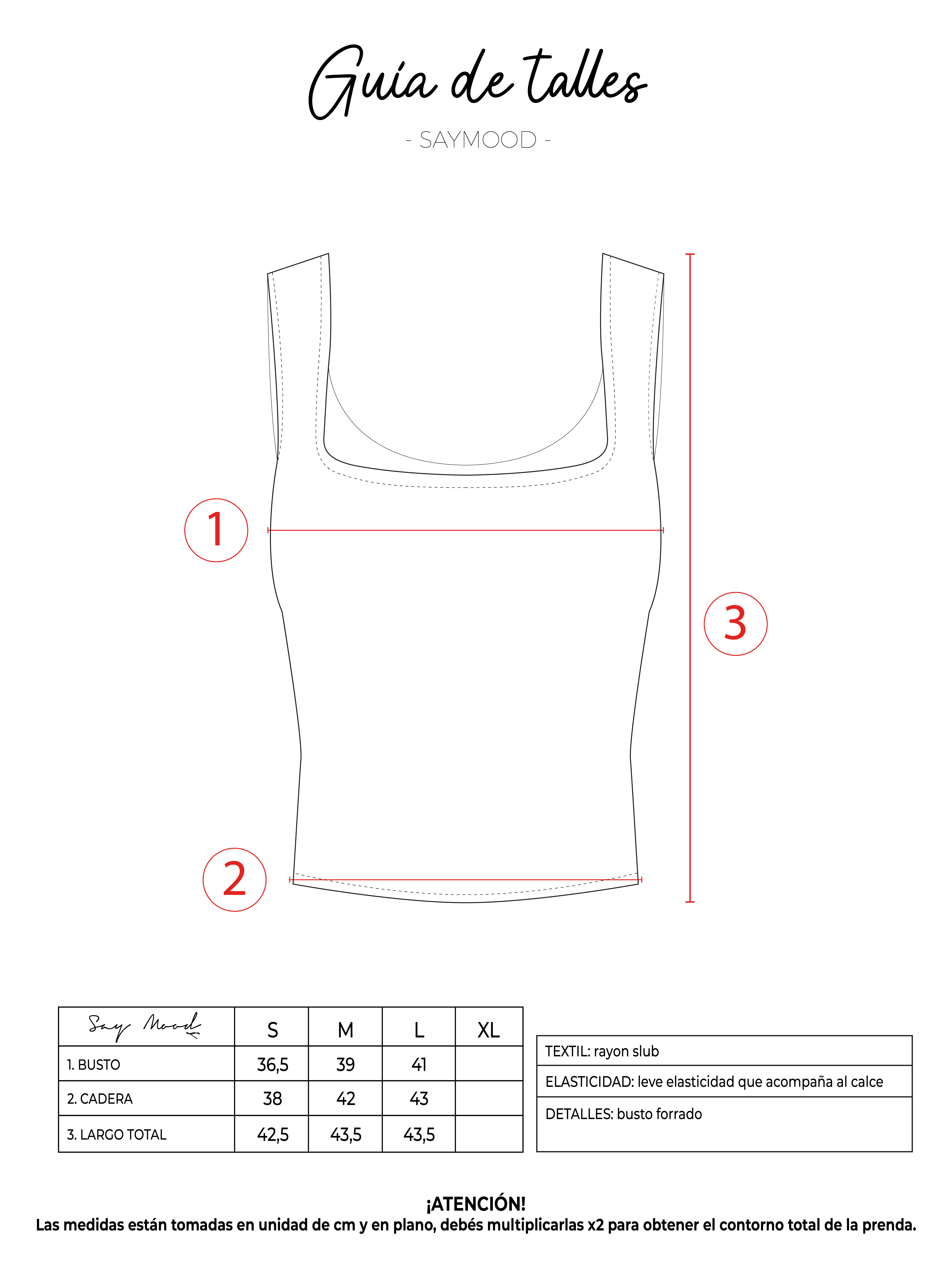 SAYTIPS: chequeá con atención nuestra tabla de talles para encontrar el que mejor vaya con vos. Podés tomar como referencia una prenda similar que tengas para mayor seguridad 😉