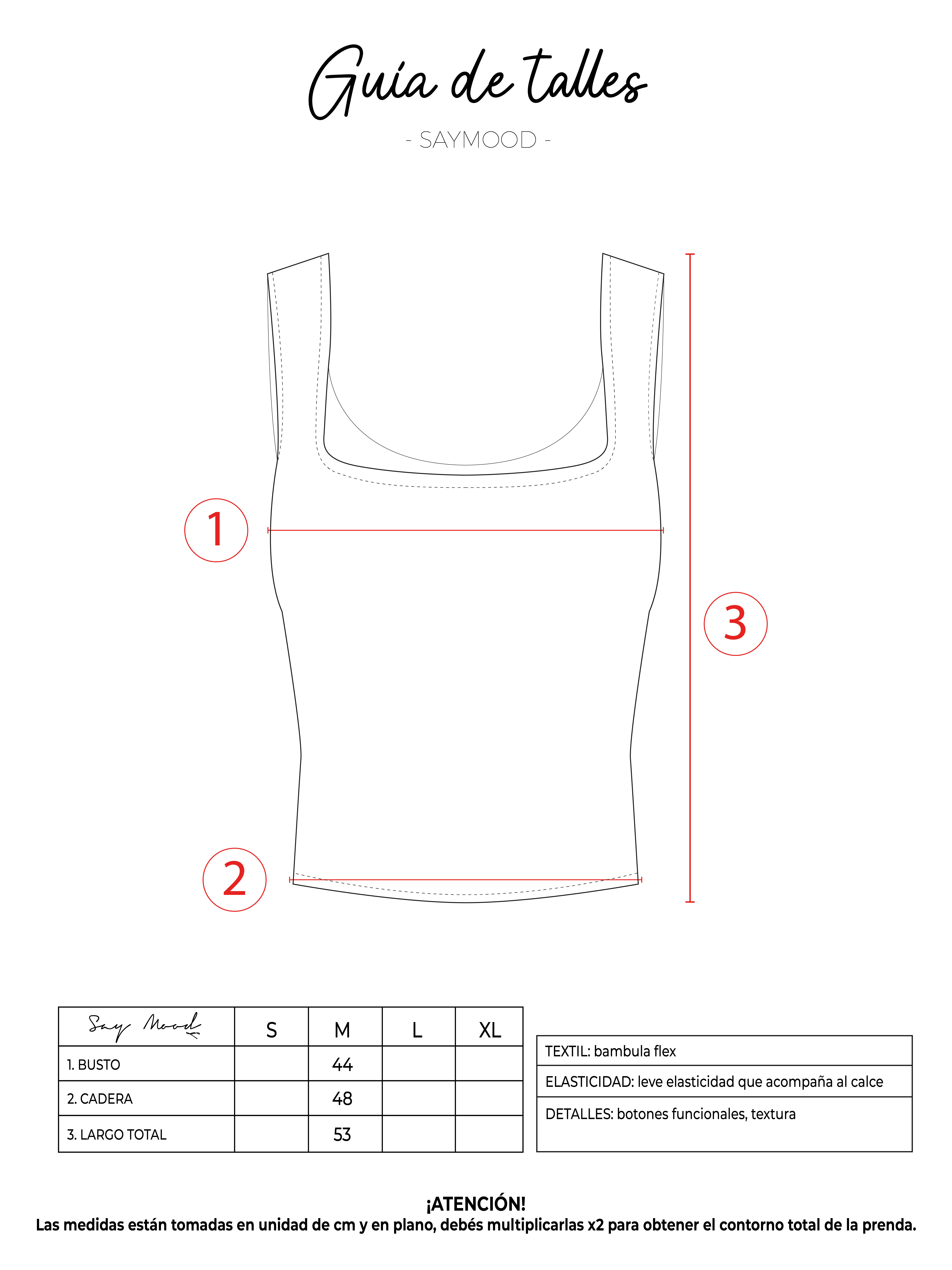 SAYTIPS: chequeá con atención nuestra tabla de talles para encontrar el que mejor vaya con vos. Podés tomar como referencia una prenda similar que tengas para mayor seguridad 😉