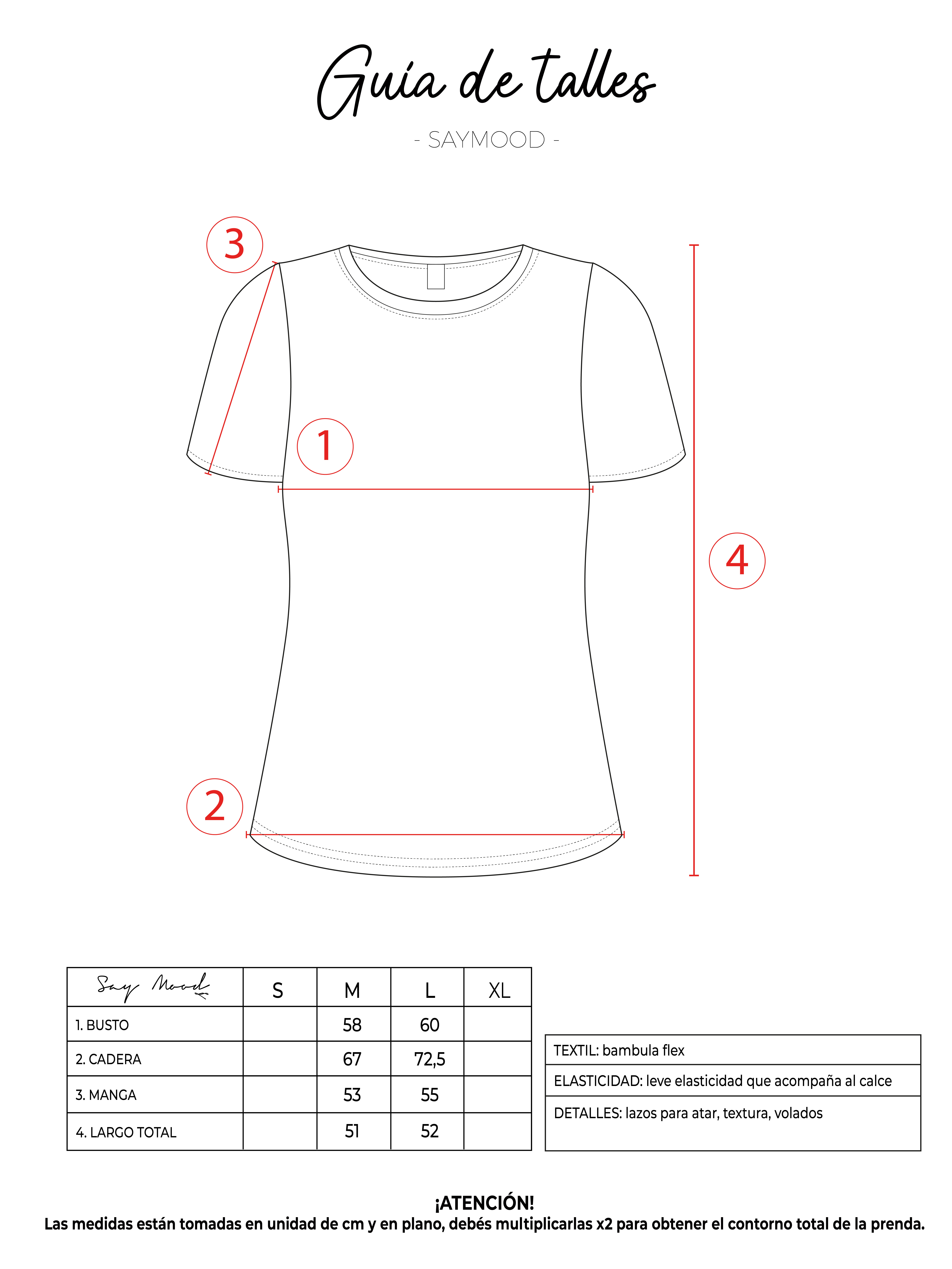 SAYTIPS: chequeá con atención nuestra tabla de talles para encontrar el que mejor vaya con vos. Podés tomar como referencia una prenda similar que tengas para mayor seguridad 😉