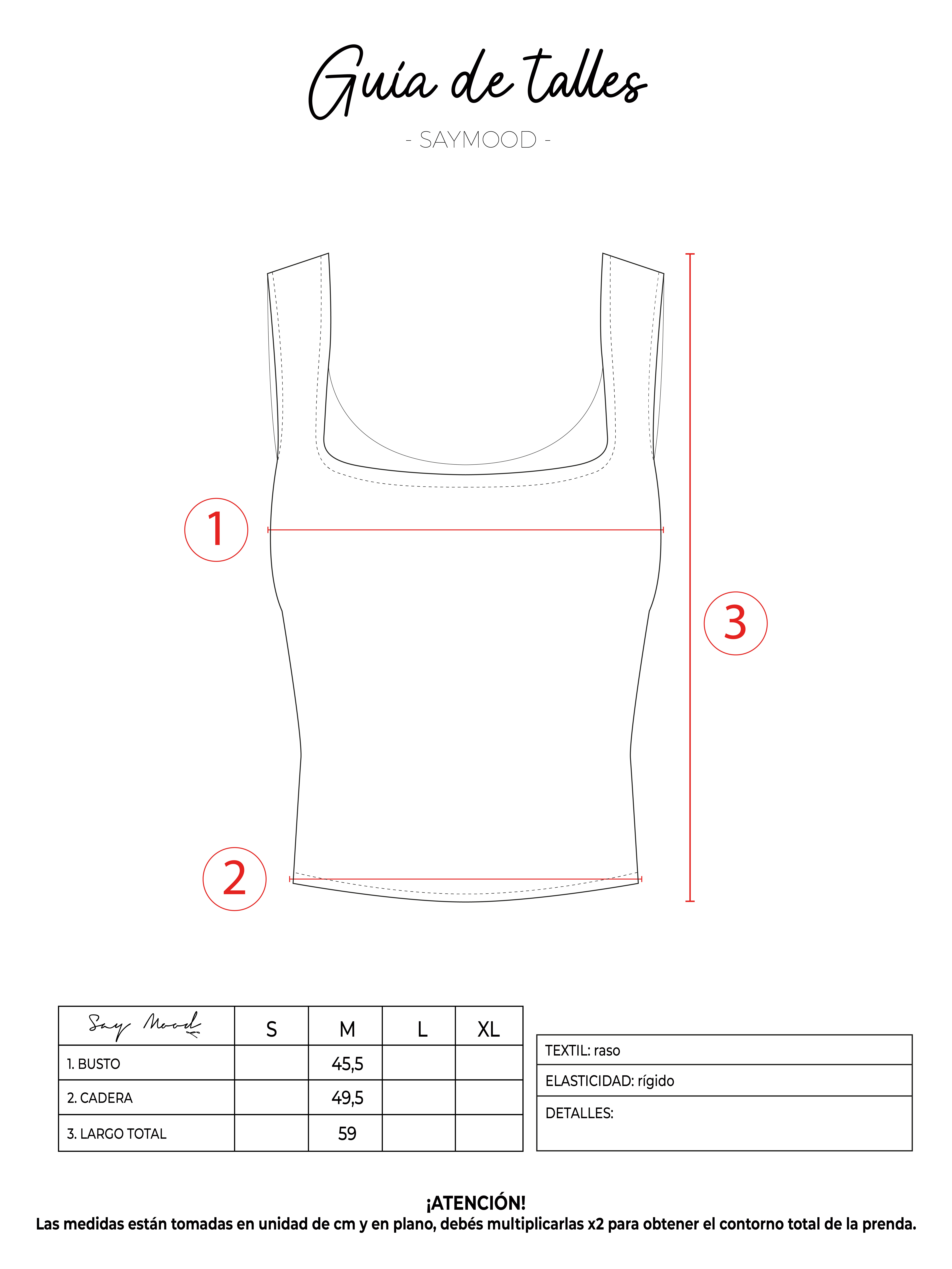 SAYTIPS: chequeá con atención nuestra tabla de talles para encontrar el que mejor vaya con vos. Podés tomar como referencia una prenda similar que tengas para mayor seguridad 😉