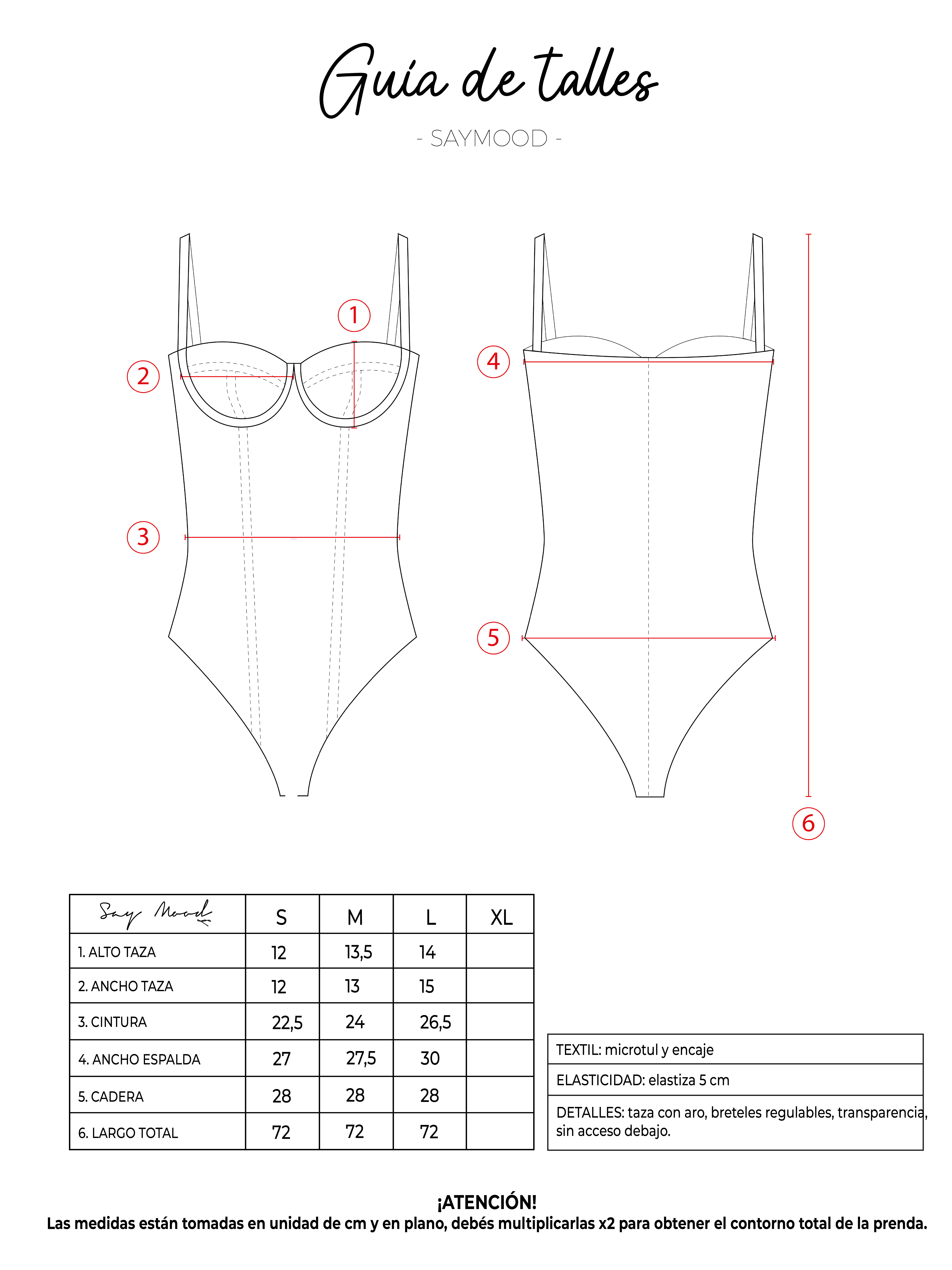 SAYTIPS: chequeá con atención nuestra tabla de talles para encontrar el que mejor vaya con vos. Podés tomar como referencia una prenda similar que tengas para mayor seguridad 😉 hey! incorporamos a esta prenda las medidas de copa en plano. El calce es entallado ya que se trata de una prenda primera piel.
