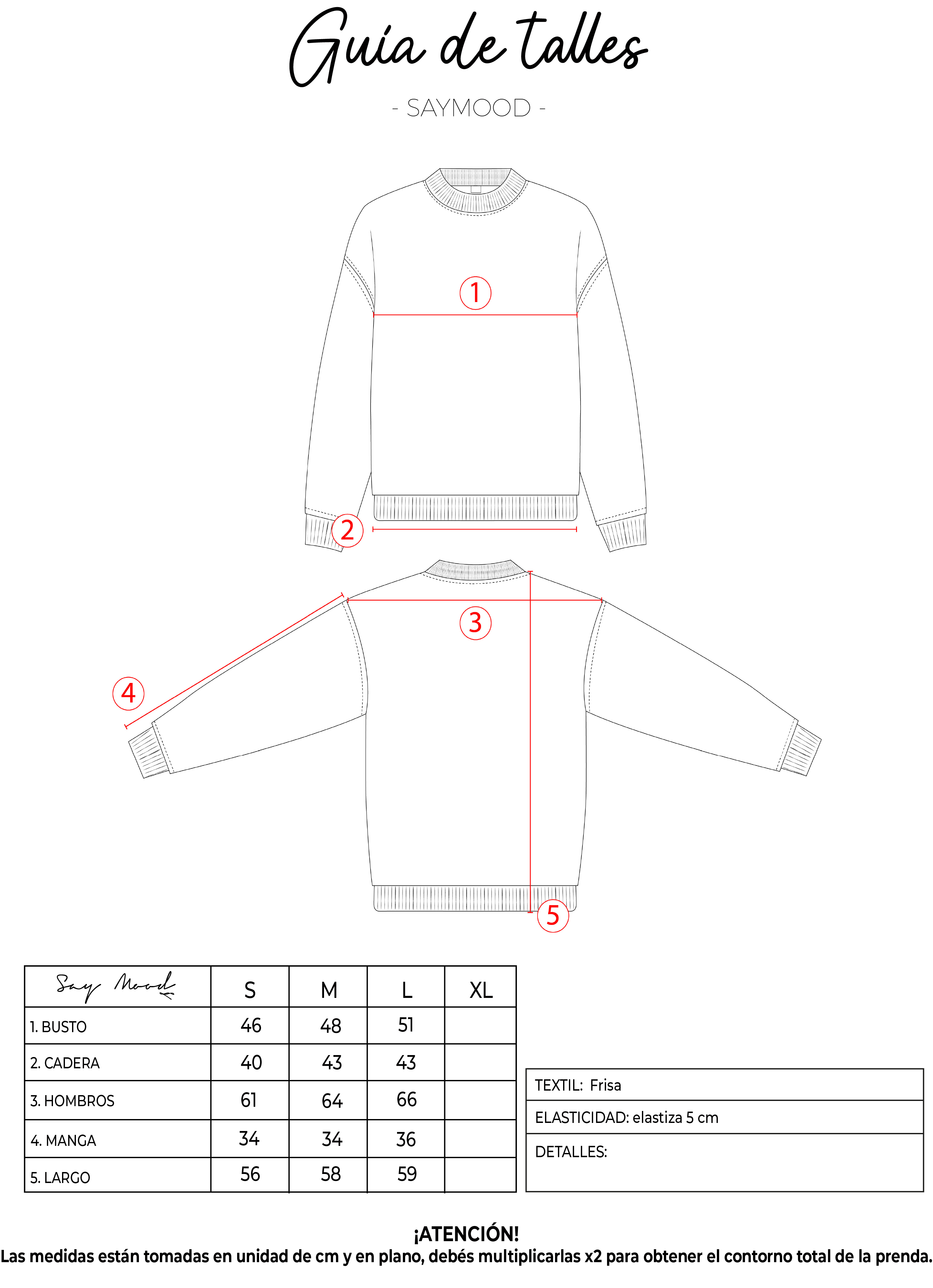 SAYTIPS: chequeá con atención nuestra tabla de talles para encontrar el que mejor vaya con vos. Podés tomar como referencia una prenda similar que tengas para mayor seguridad.