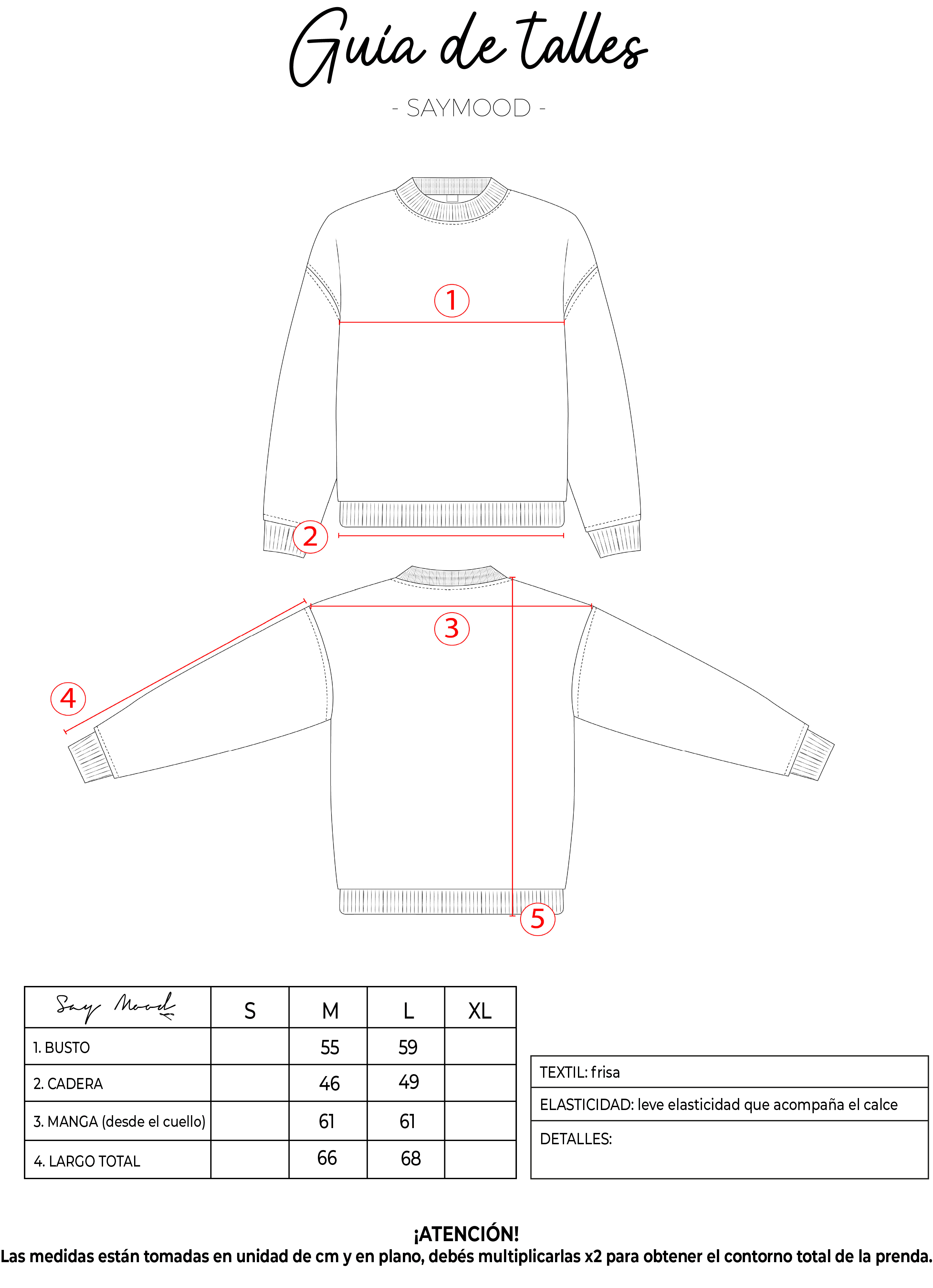 SAYTIPS: chequeá con atención nuestra tabla de talles para encontrar el que mejor vaya con vos. Podés tomar como referencia una prenda similar que tengas para mayor seguridad.