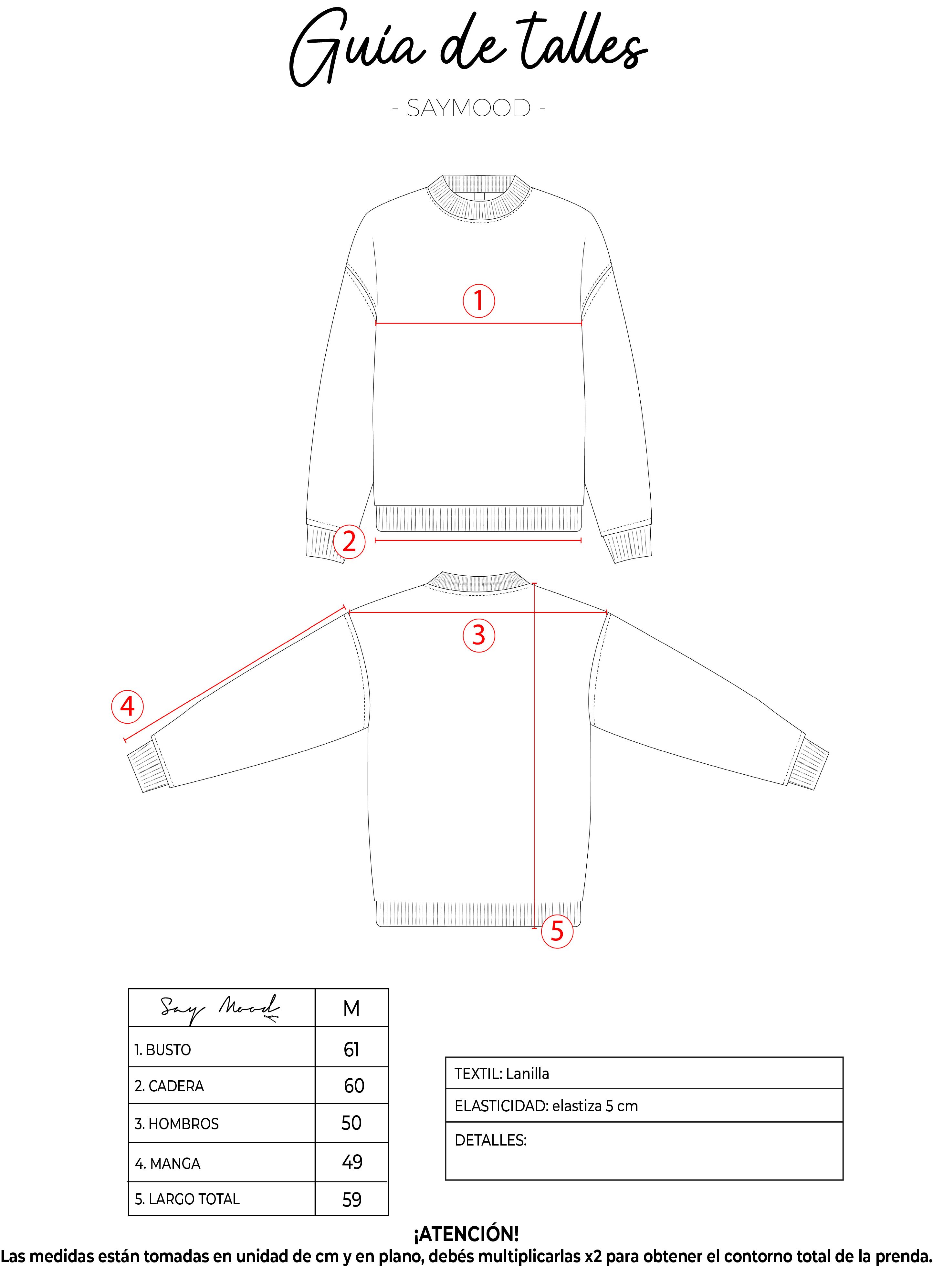 SAYTIPS: chequeá con atención nuestra tabla de talles para encontrar el que mejor vaya con vos. Podés tomar como referencia una prenda similar que tengas para mayor seguridad.