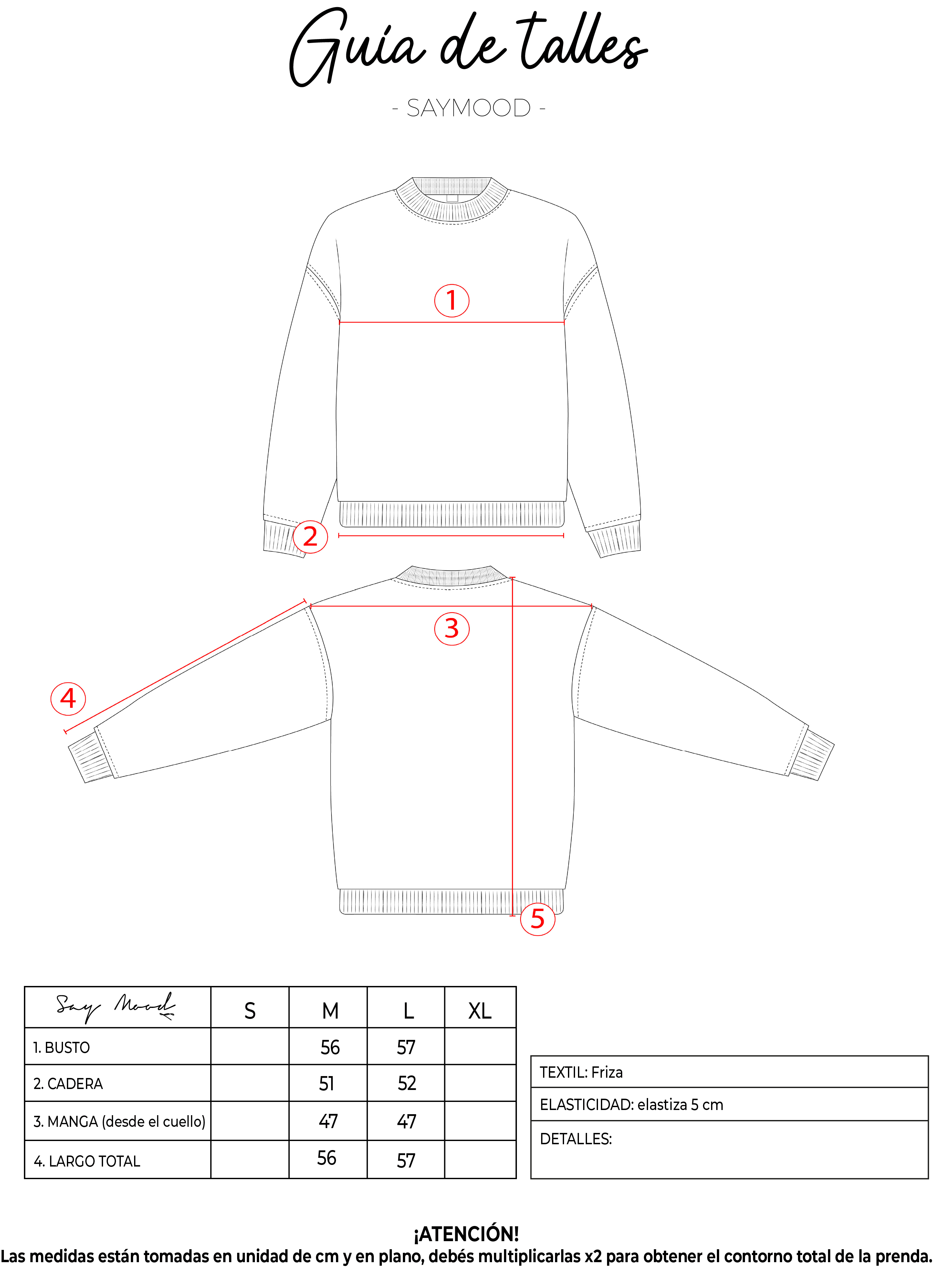 SAYTIPS: chequeá con atención nuestra tabla de talles para encontrar el que mejor vaya con vos. Podés tomar como referencia una prenda similar que tengas para mayor seguridad 😉