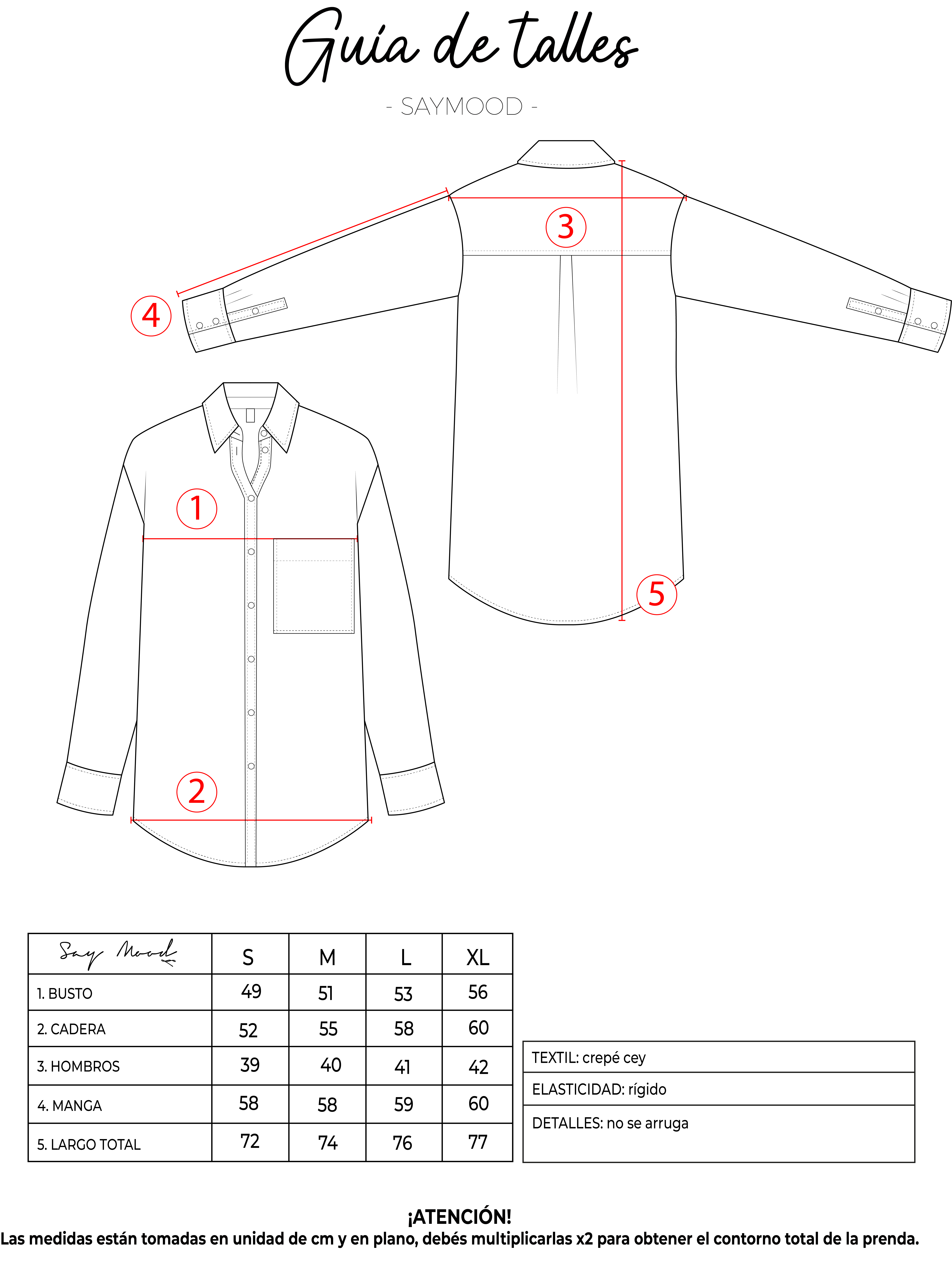 SAYTIPS: chequeá con atención nuestra tabla de talles para encontrar el que mejor vaya con vos. Podés tomar como referencia una prenda similar que tengas para mayor seguridad.