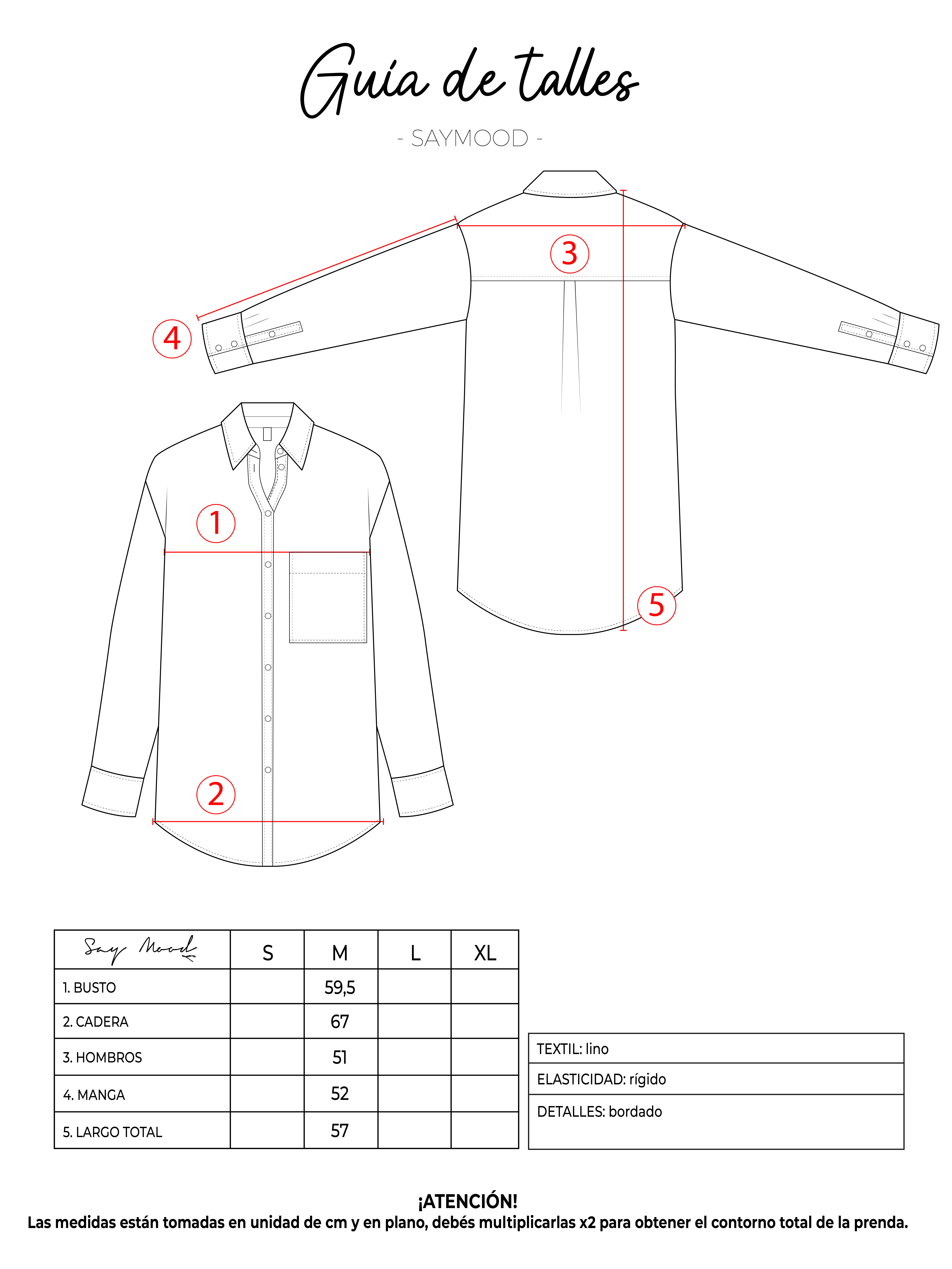 SAYTIPS: chequeá con atención nuestra tabla de talles para encontrar el que mejor vaya con vos. Podés tomar como referencia una prenda similar que tengas para mayor seguridad 😉