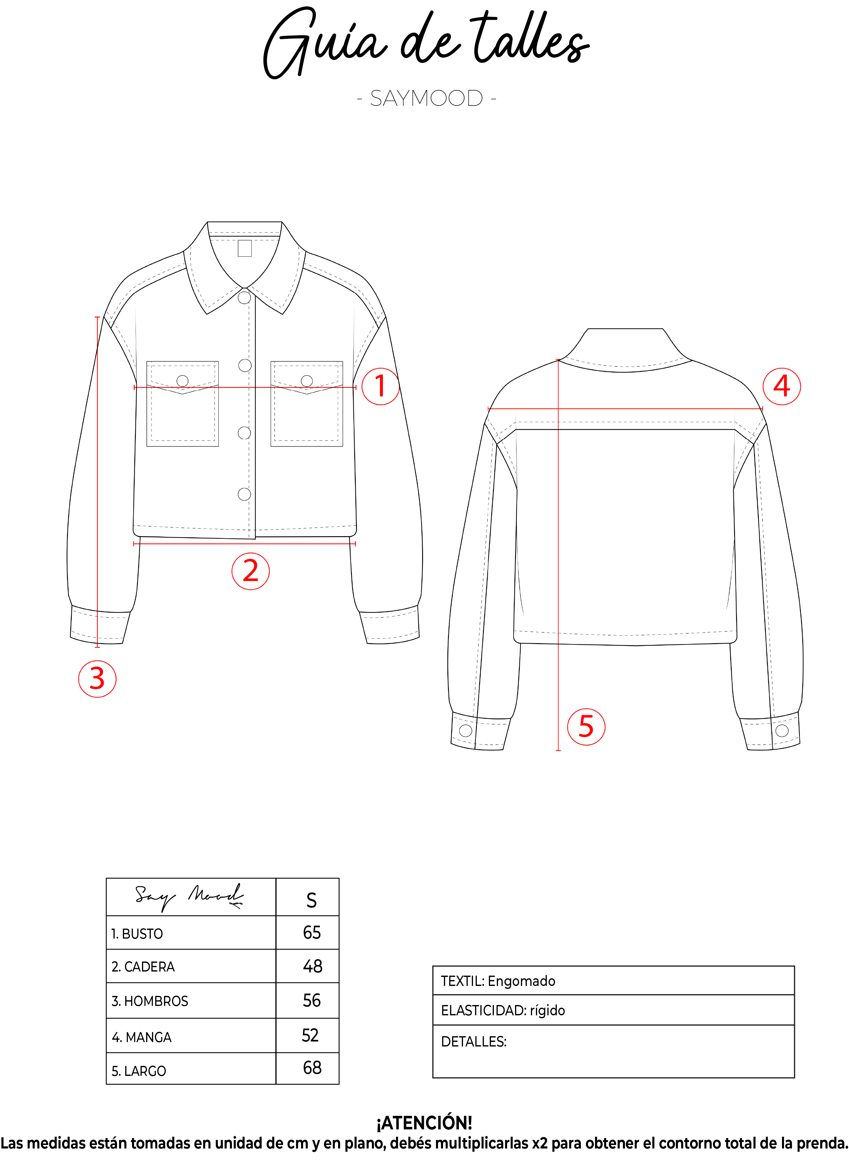 SAYTIPS: chequeá con atención nuestra tabla de talles para encontrar el que mejor vaya con vos. Podés tomar como referencia una prenda similar que tengas para mayor seguridad.