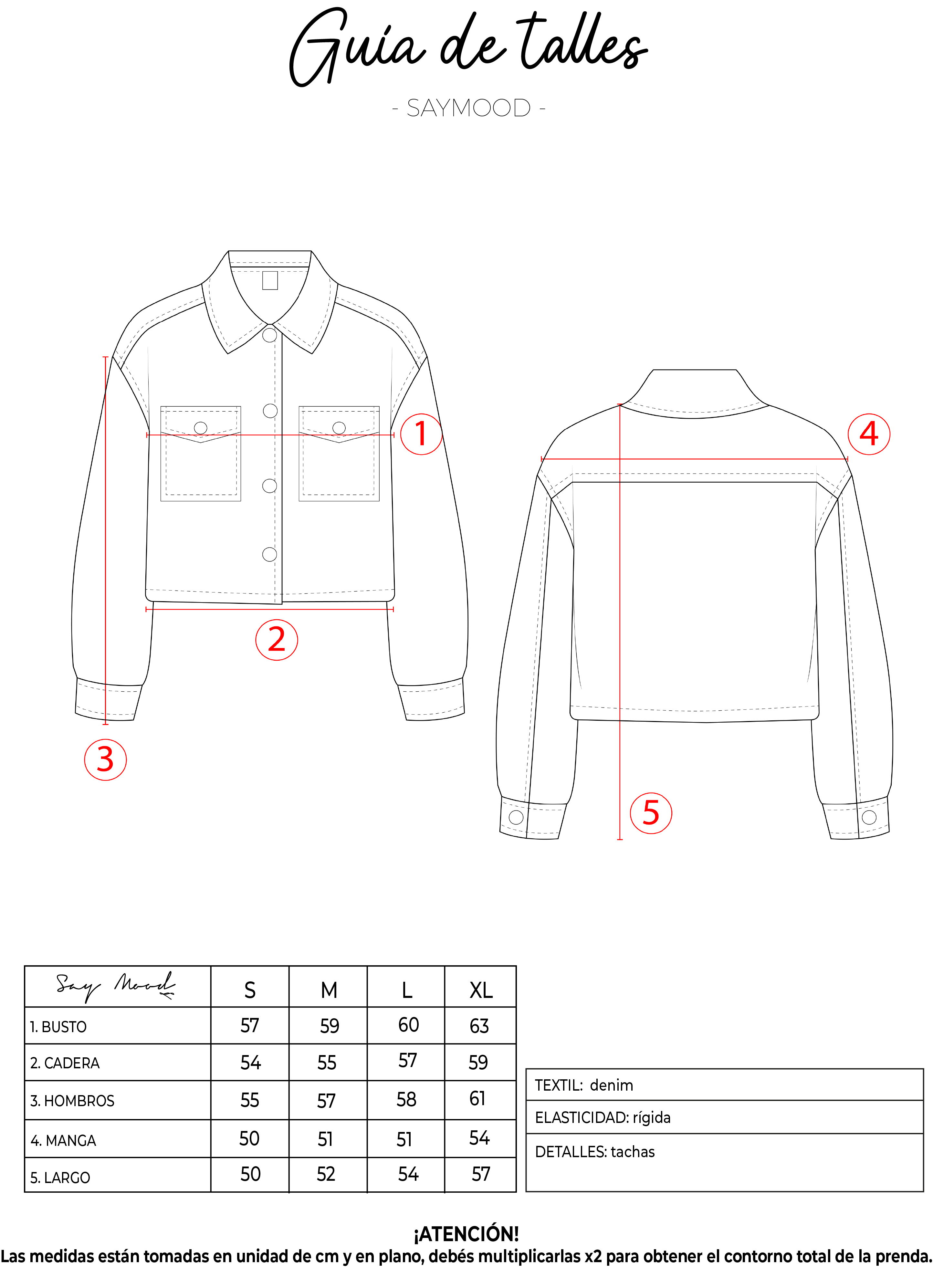SAYTIPS: chequeá con atención nuestra tabla de talles para encontrar el que mejor vaya con vos. Podés tomar como referencia una prenda similar que tengas para mayor seguridad.