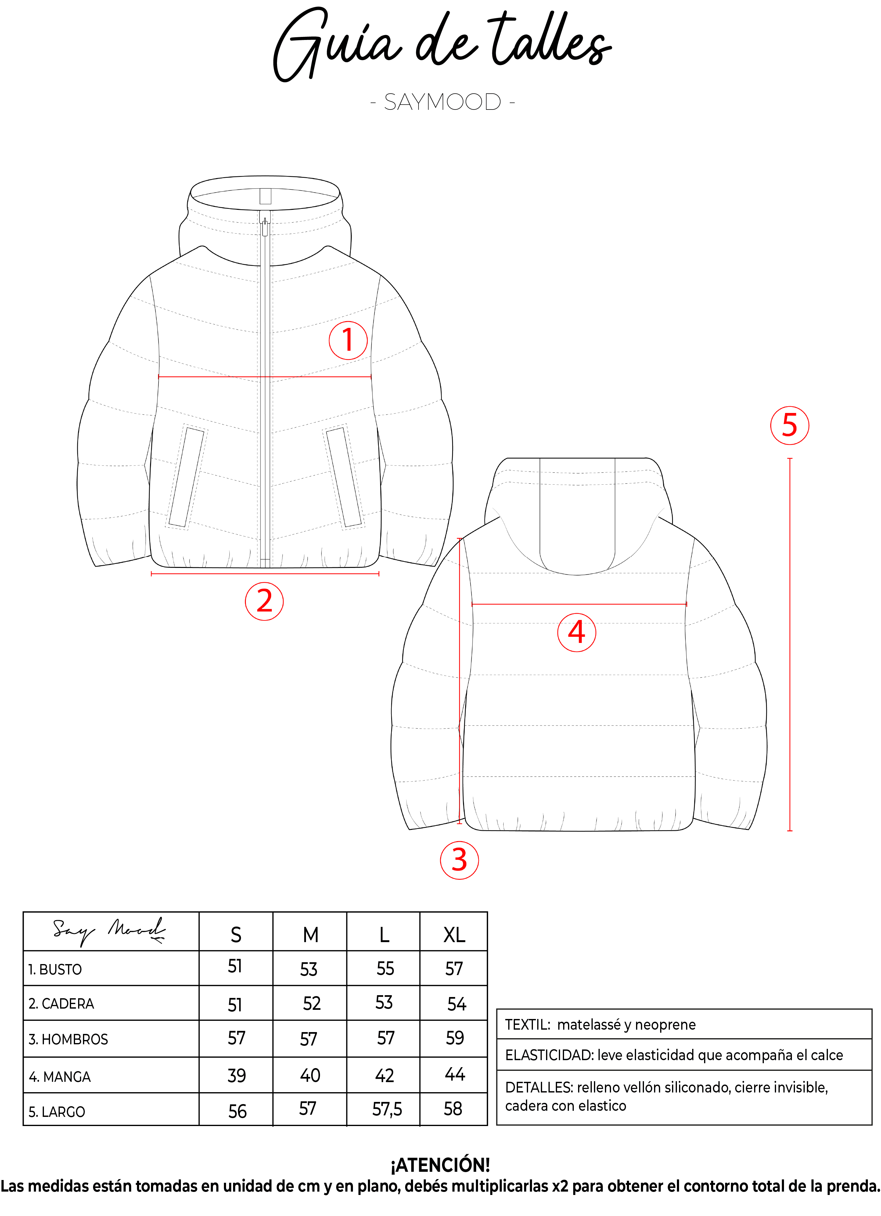 SAYTIPS: chequeá con atención nuestra tabla de talles para encontrar el que mejor vaya con vos. Podés tomar como referencia una prenda similar que tengas para mayor seguridad 😉