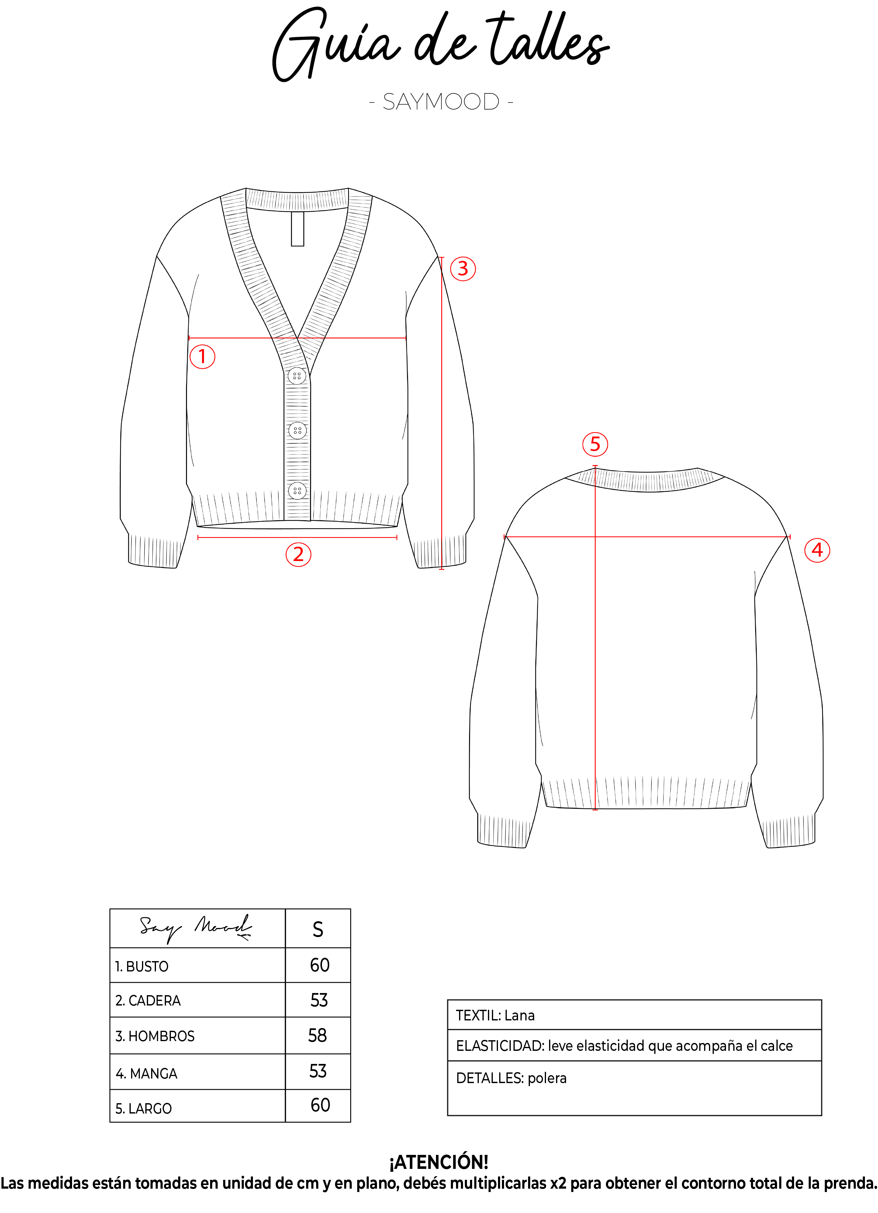 SAYTIPS: chequeá con atención nuestra tabla de talles para encontrar el que mejor vaya con vos. Podés tomar como referencia una prenda similar que tengas para mayor seguridad 😉