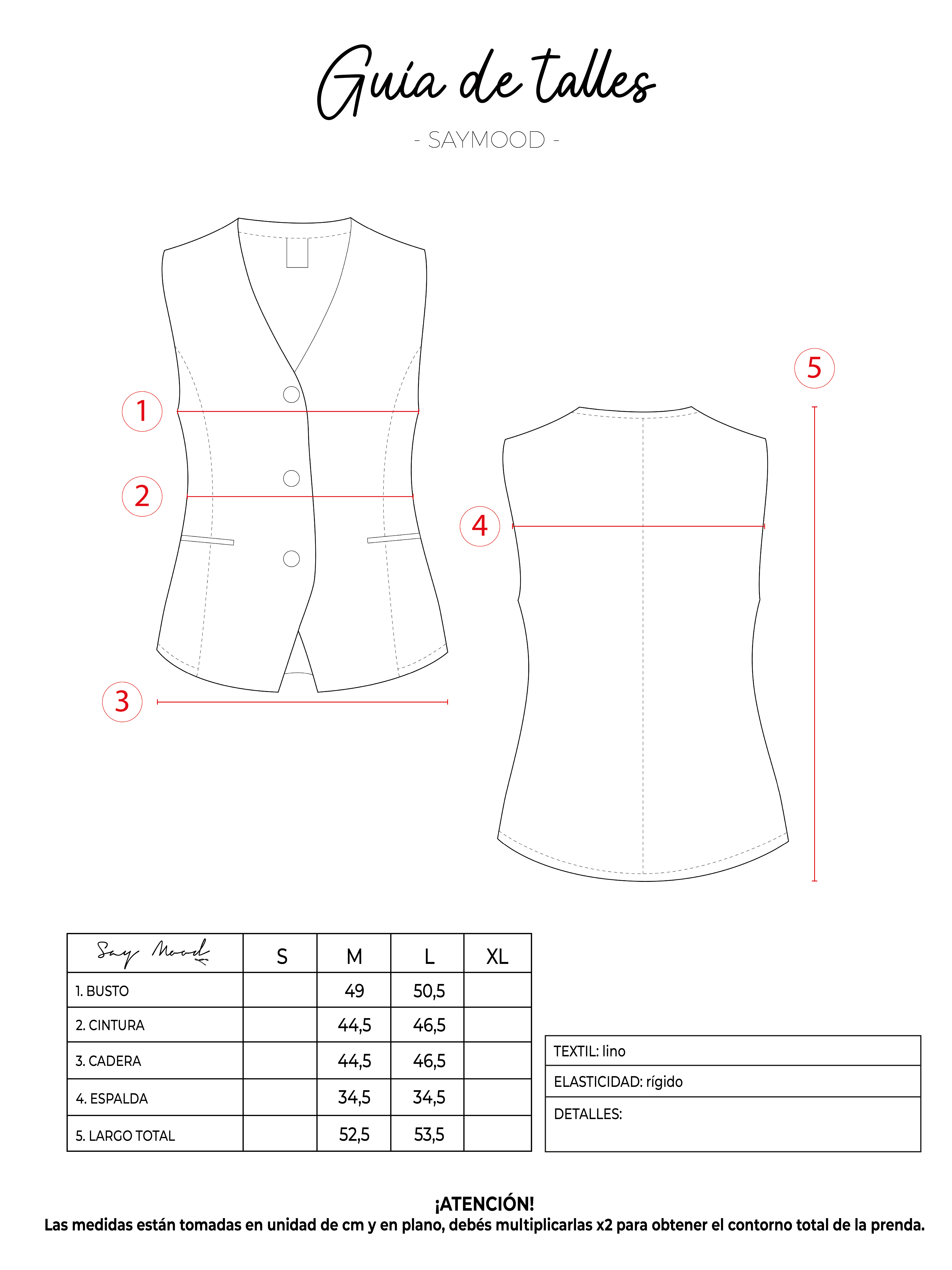 SAYTIPS: chequeá con atención nuestra tabla de talles para encontrar el que mejor vaya con vos. Podés tomar como referencia una prenda similar que tengas para mayor seguridad 😉