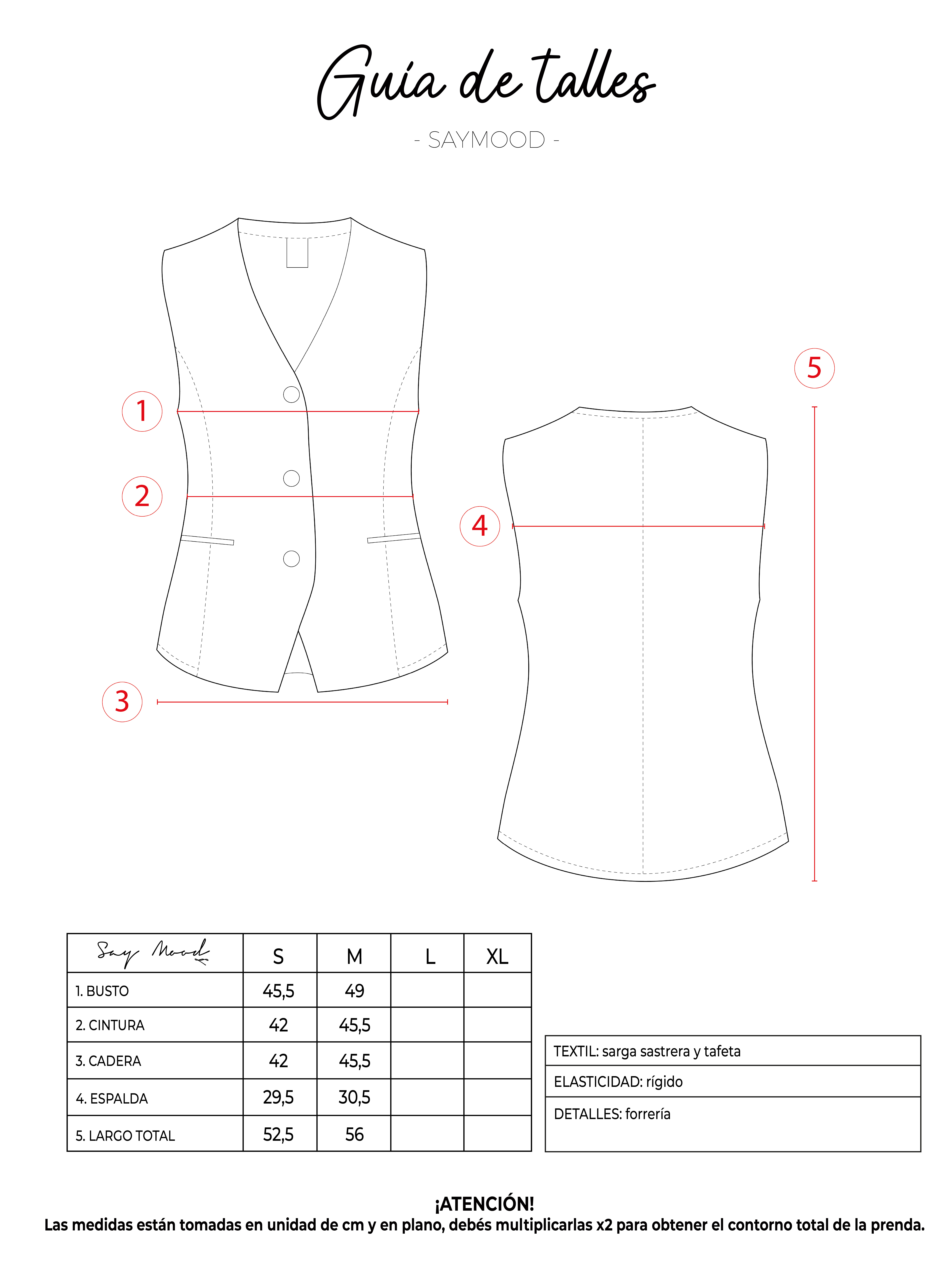 SAYTIPS: chequeá con atención nuestra tabla de talles para encontrar el que mejor vaya con vos. Podés tomar como referencia una prenda similar que tengas para mayor seguridad 😉