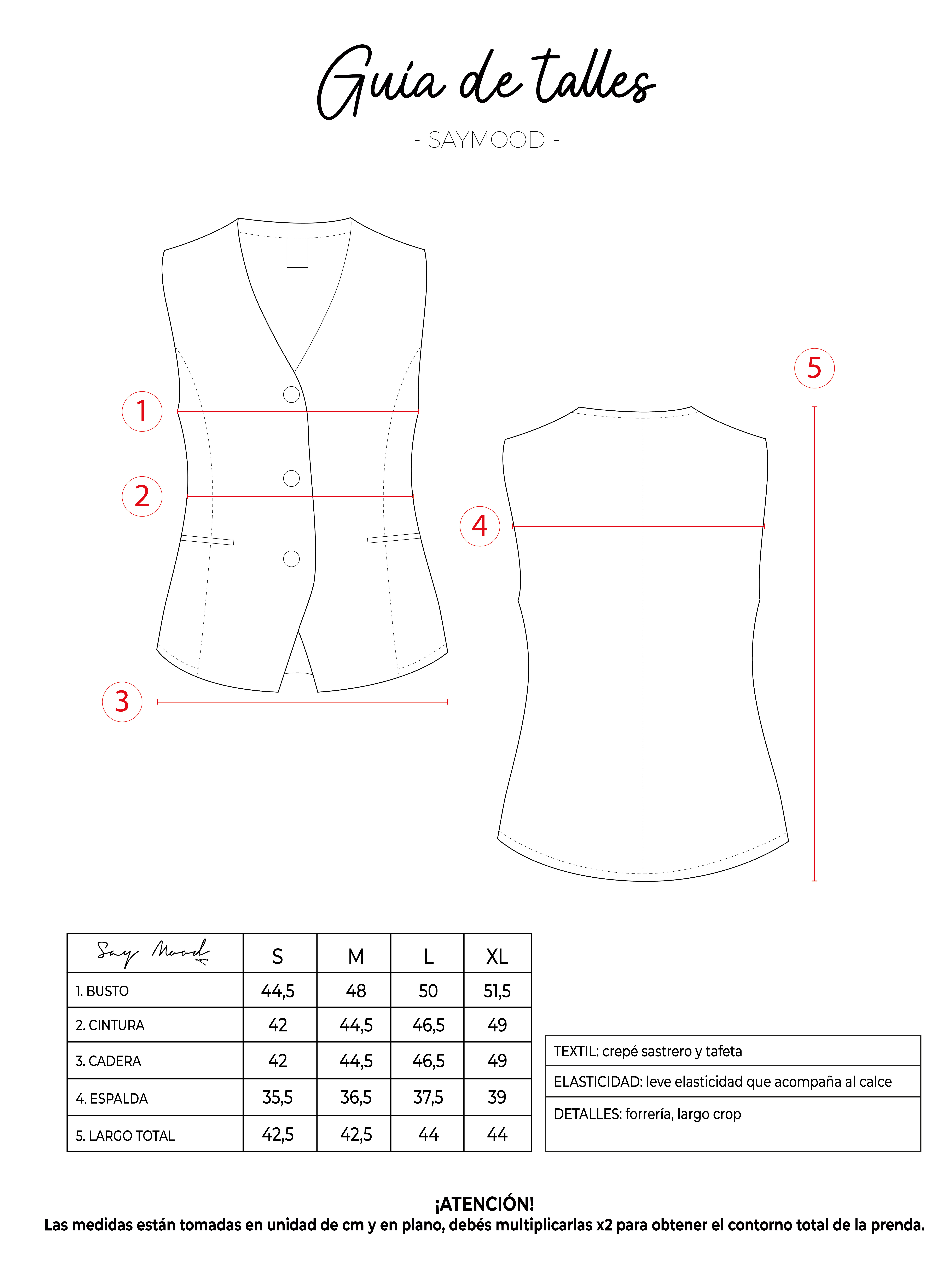 SAYTIPS: chequeá con atención nuestra tabla de talles para encontrar el que mejor vaya con vos. Podés tomar como referencia una prenda similar que tengas para mayor seguridad 😉