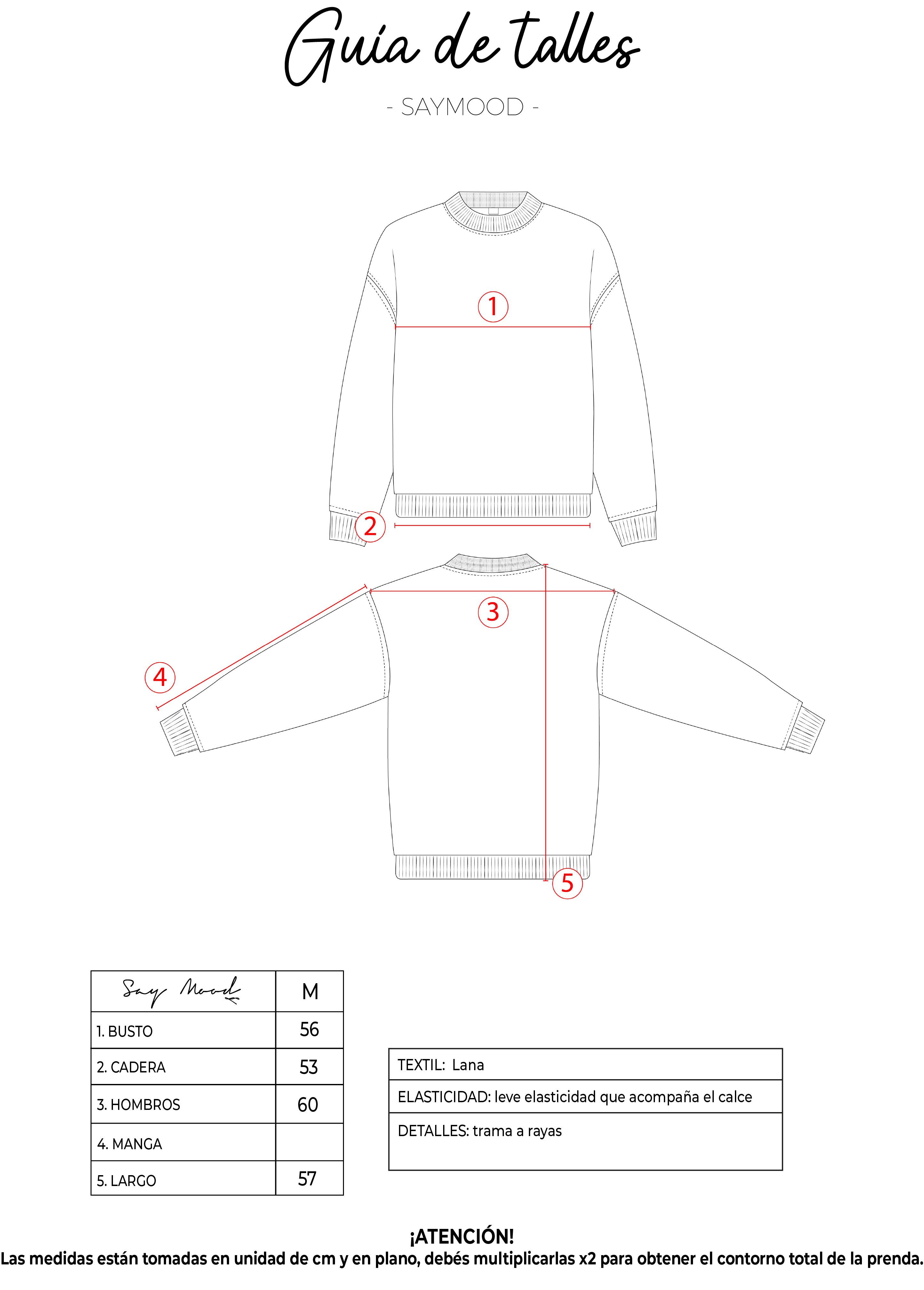 SAYTIPS: chequeá con atención nuestra tabla de talles para encontrar el que mejor vaya con vos. Podés tomar como referencia una prenda similar que tengas para mayor seguridad.