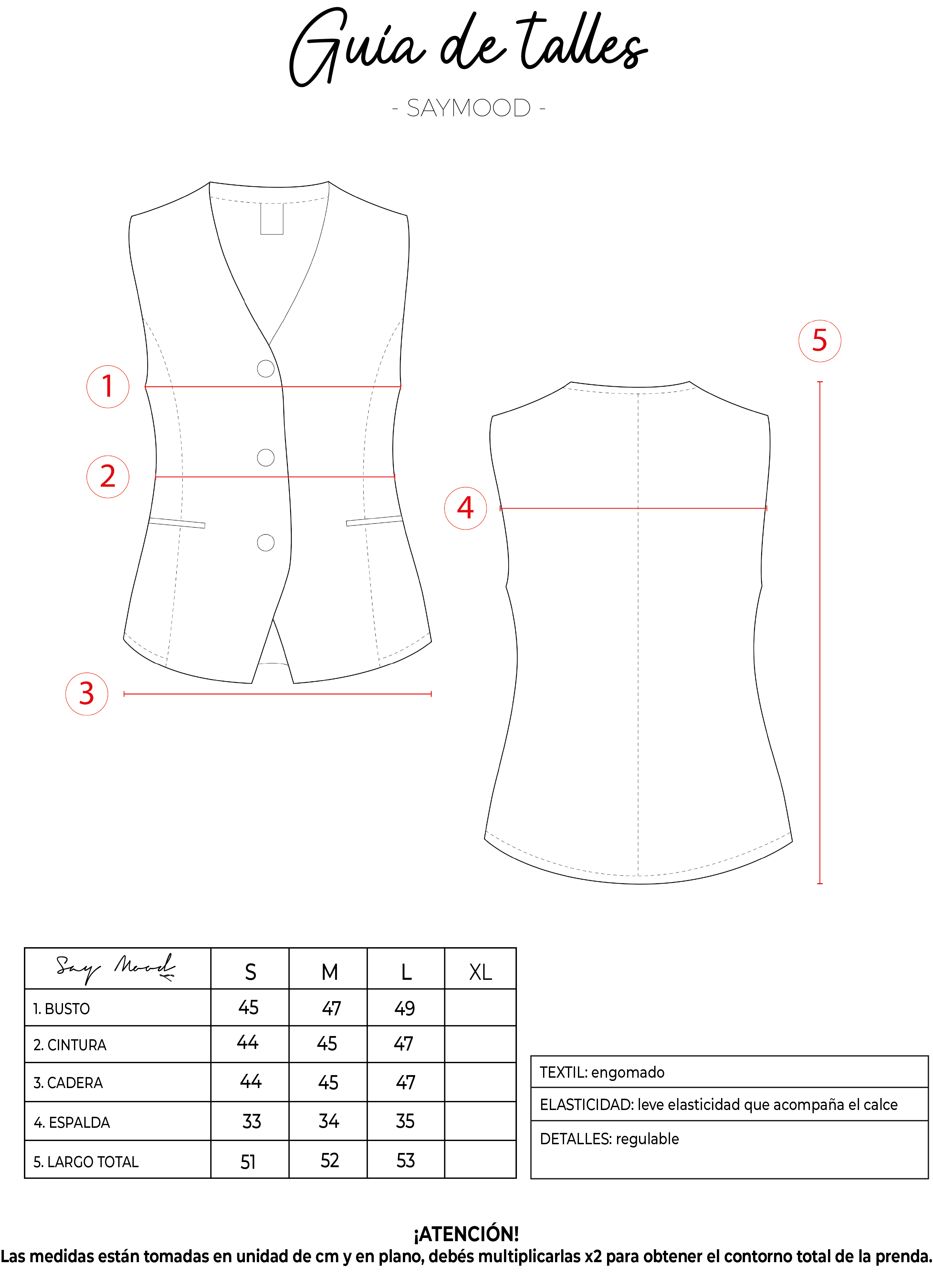SAYTIPS: chequeá con atención nuestra tabla de talles para encontrar el que mejor vaya con vos. Podés tomar como referencia una prenda similar que tengas para mayor seguridad 😉
