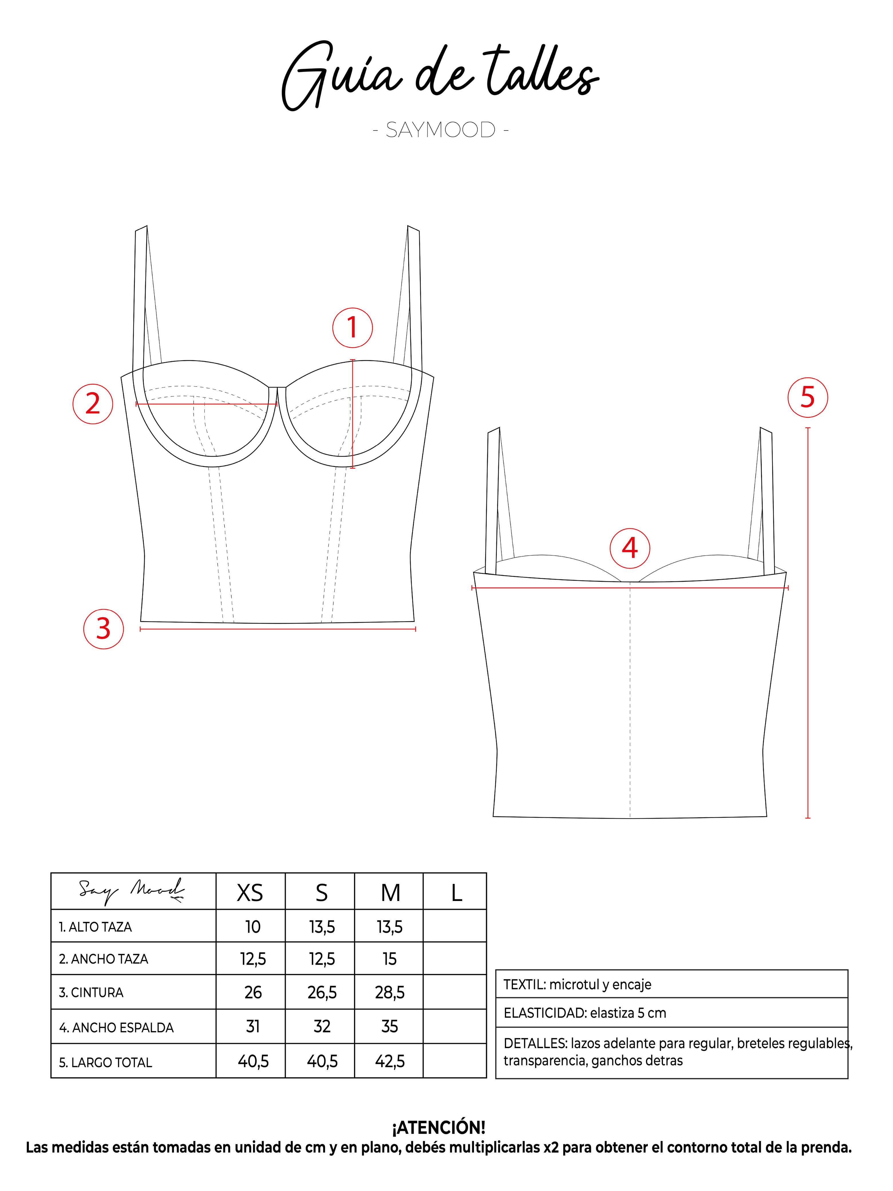 SAYTIPS: chequeá con atención nuestra tabla de talles para encontrar el que mejor vaya con vos. Podés tomar como referencia una prenda similar que tengas para mayor seguridad 😉 hey! incorporamos a esta prenda las medidas de copa en plano. El calce es entallado ya que se trata de una prenda primera piel.