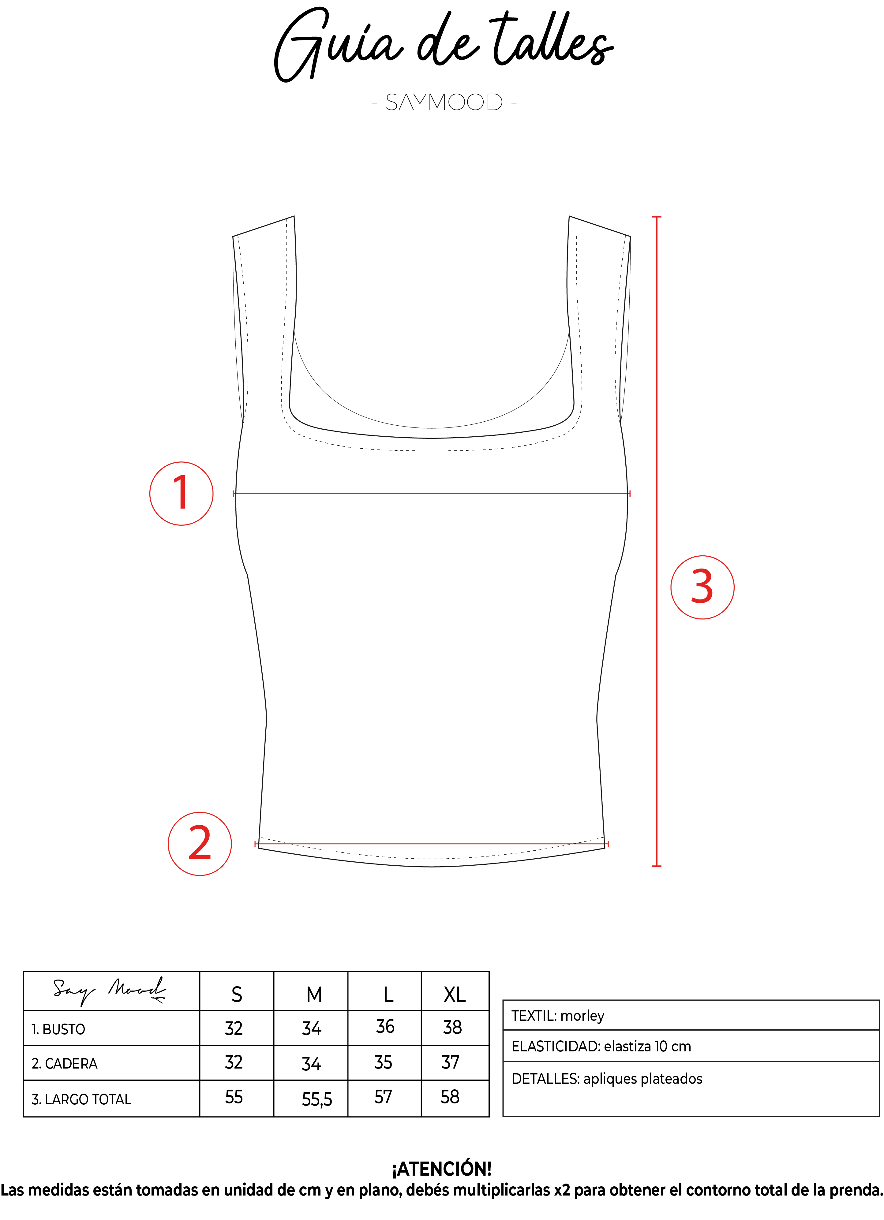 SAYTIPS: chequeá con atención nuestra tabla de talles para encontrar el que mejor vaya con vos. Podés tomar como referencia una prenda similar que tengas para mayor seguridad 😉