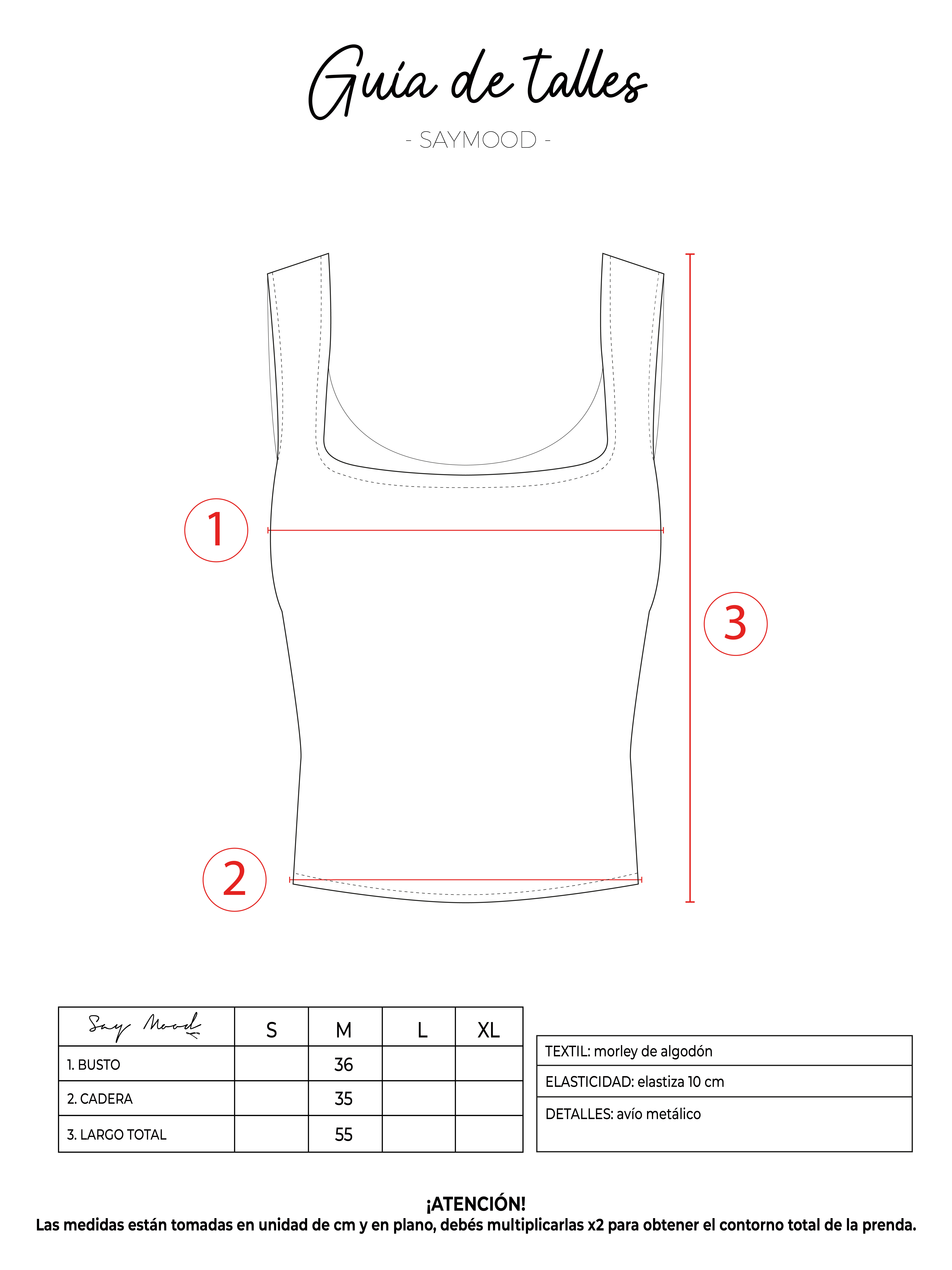 SAYTIPS: chequeá con atención nuestra tabla de talles para encontrar el que mejor vaya con vos. Podés tomar como referencia una prenda similar que tengas para mayor seguridad 😉