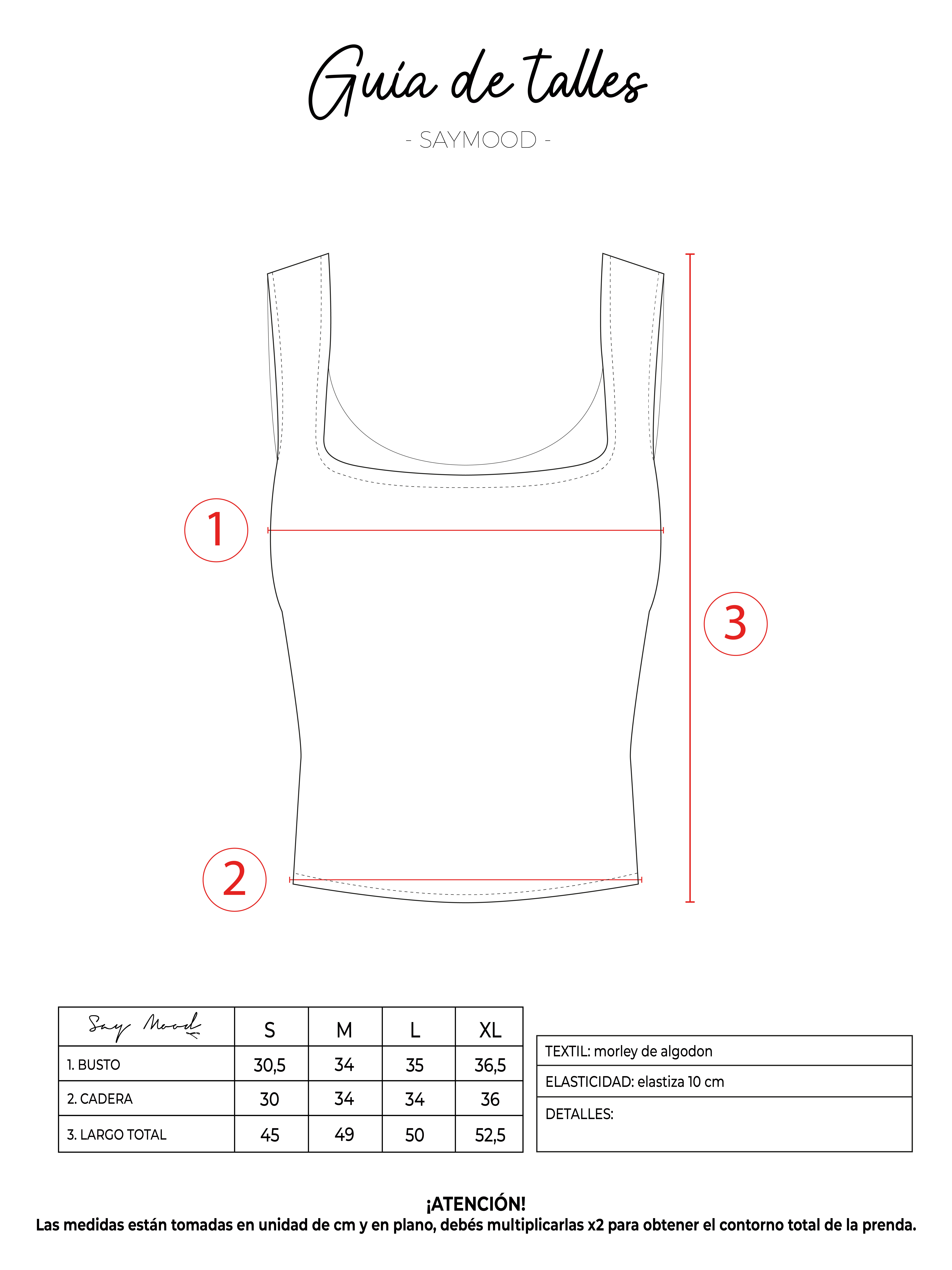 SAYTIPS: chequeá con atención nuestra tabla de talles para encontrar el que mejor vaya con vos. Podés tomar como referencia una prenda similar que tengas para mayor seguridad 😉